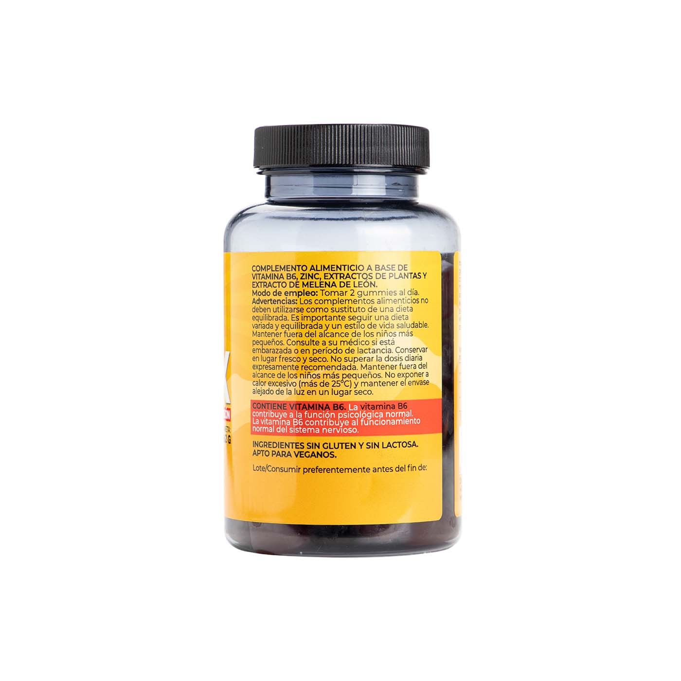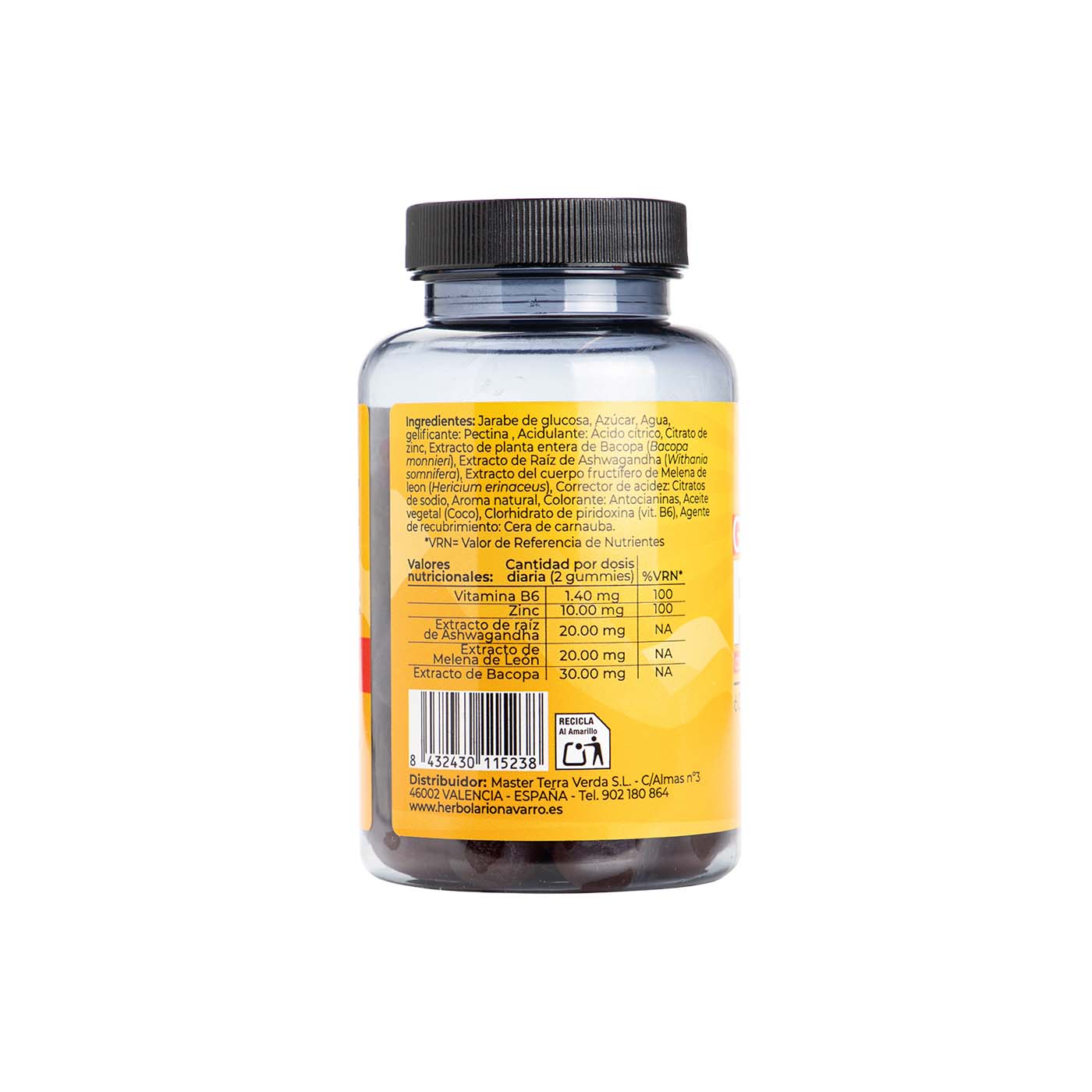 Valores nutricionales (cantidad por dosis diaria, 2 gummies): Vitamina B6 1,40mg (100%VRN*); Zinc 10,00mg (100%VRN*); Extracto de raíz de Ashwagandha 20,00mg; Extracto de Melena de León 20,00mg; Extracto de Bacopa 30,00mg. *VRN= Valor de Referencia de Nutrientes