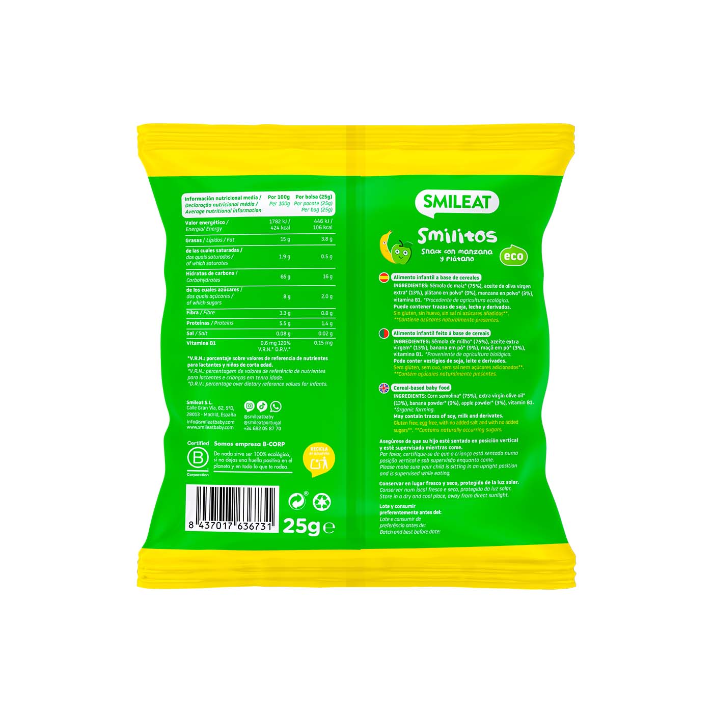 ¡El snack que hace sonreír a los más pequeños! Con los Smilitos de Manzana y Plátano, cada merienda se transforma en una celebración de sabores y diversión. Sin hornear, sin aditivos, y sin azúcares añadidos, sal, huevo ni gluten. ¡Solo pura alegría en cada bocado!