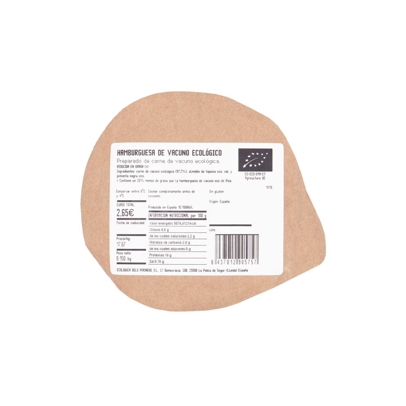 Exquisita hamburguesa de ternera procedente de ganadería ecológica, reducida en grasa, con carne de vacuno 100% origen Pirineos. Un sabor auténtico en una hamburguesa única.