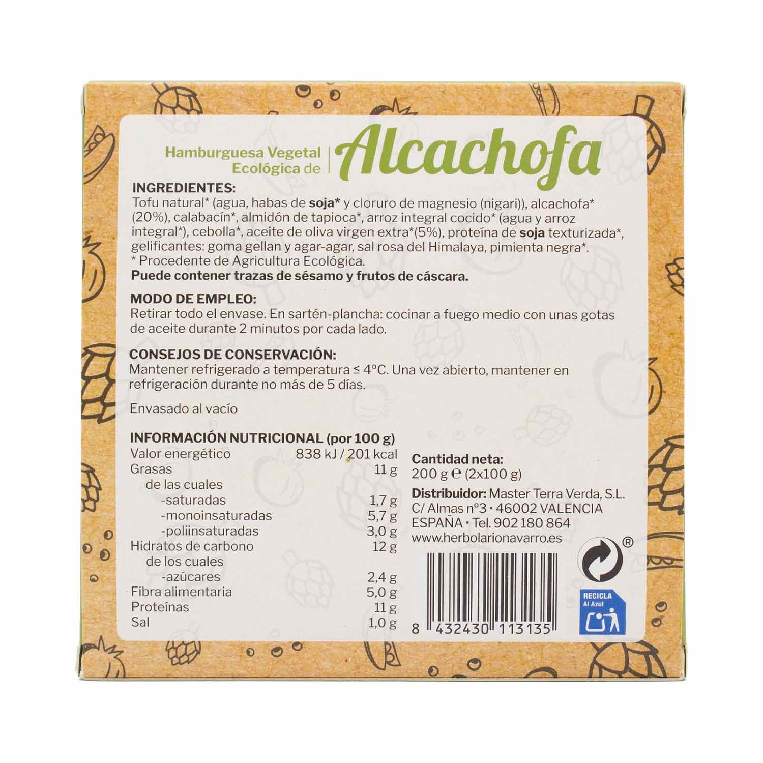 Retirar todo el envase. Cocinar en sartén o plancha a fuego medio con unas gotas de aceite durante 2 minutos por cada lado. Sirve tu hamburguesa con alcachofa en un pan integral, acompañada de tus ingredientes favoritos.