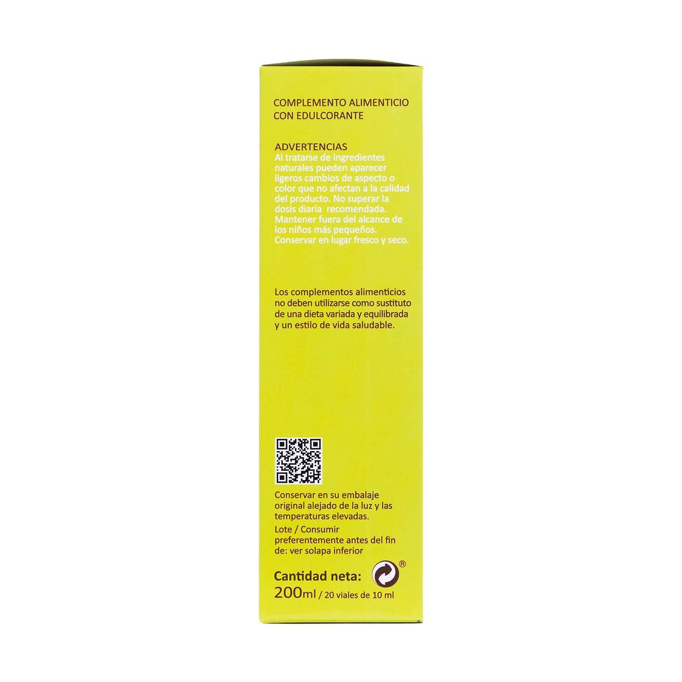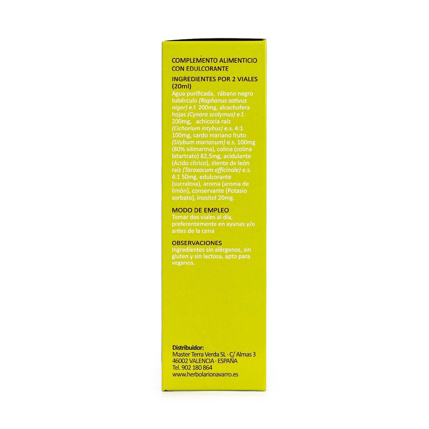 Ingredientes por 2 viales (20ml): Agua purificada, rábano negro tubérculo (Raphanus sativus niger) e.f. 200mg, alcachofera hojas (Cynara scolymus) e.f. 200mg, achicoria raíz (Cichorium intybus) e.s. 4:1 100mg, cardo mariano fruto (Silybum marianum) e.s. 100mg (80% silimarina), colina (colina bitartrato) 82,5mg, acidulante (Ácido cítrico), diente de león raíz (Taraxcum officinale) e.s. 4:! 50mg, edulcorante (sucralosa), aroma (aroma de limón), conservante (Potasio sorbato), inositol 20mg.
