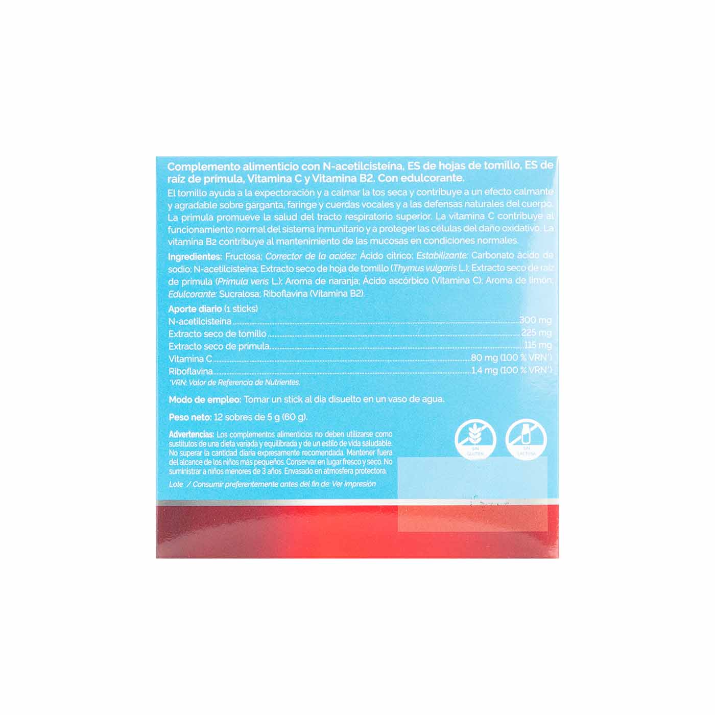Por toma diaria (1 stick): N-acetilcisteína 300 mg, EN tomillo 225 mg, EN prímula 115 mg, Vitamina C 80 mg 100% VRN*. Vitamina B2, Riboflavina 1,4 100% VRN*.
