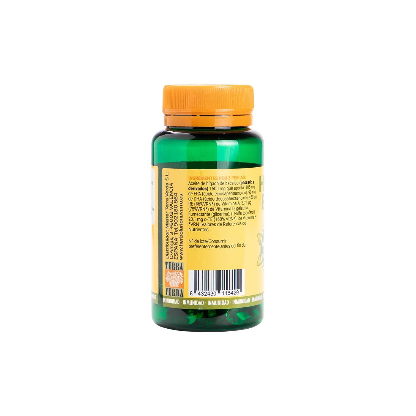 El Hígado de Bacalao de Terra Verda es un complemento alimenticio en cápsulas que contiene aceite de hígado de bacalao, un ingrediente natural rico en ácidos grasos esenciales, como el EPA (ácido eicosapentaenoico) y el DHA (ácido docosahexaenoico), así como en vitaminas esenciales como la vitamina A, vitamina D y vitamina E. Este aceite es conocido por sus beneficios.