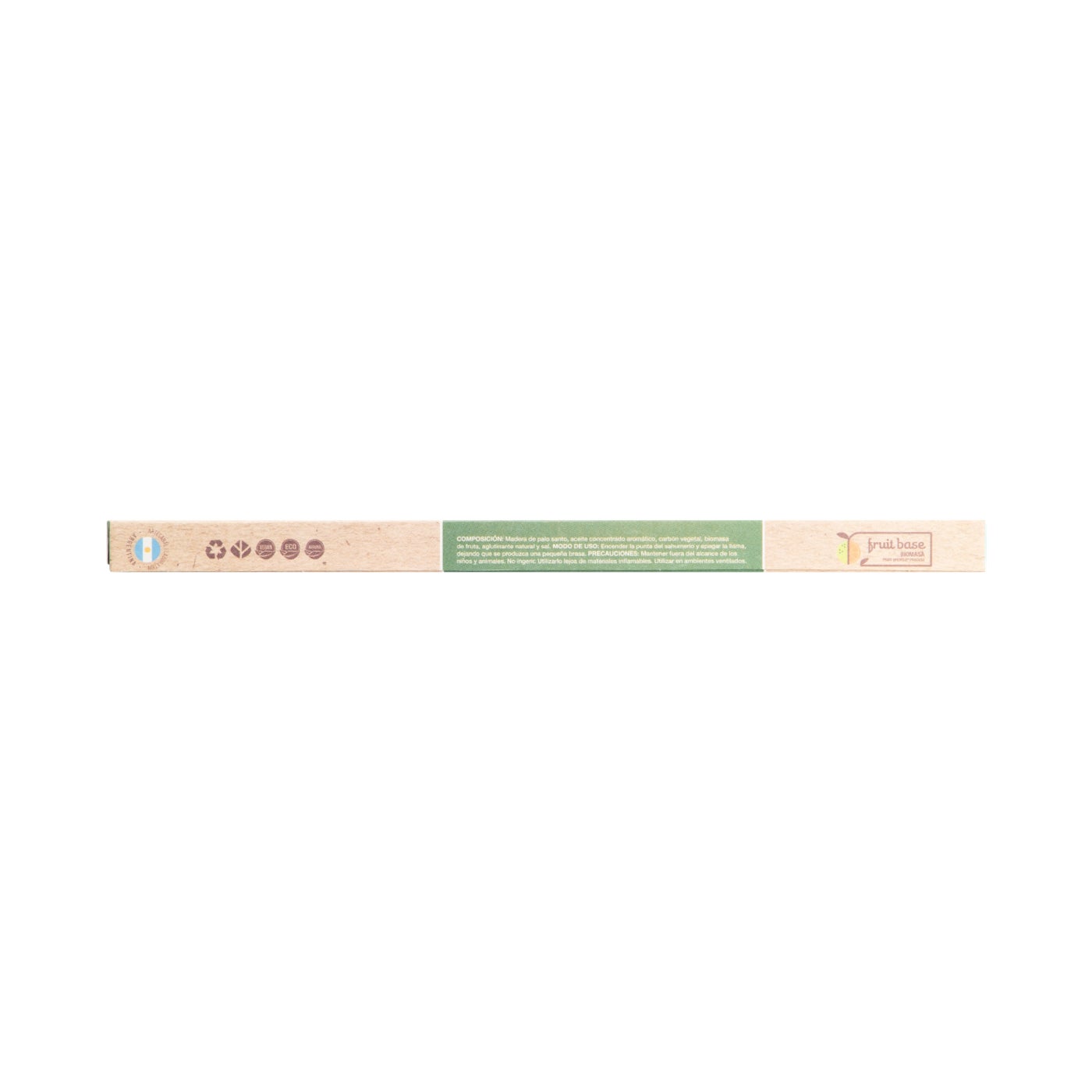 Madera de palo santo (Perú), aceite concentrado aromático, carbón vegetal, biomasa de fruta, aglutinante natural y sal.