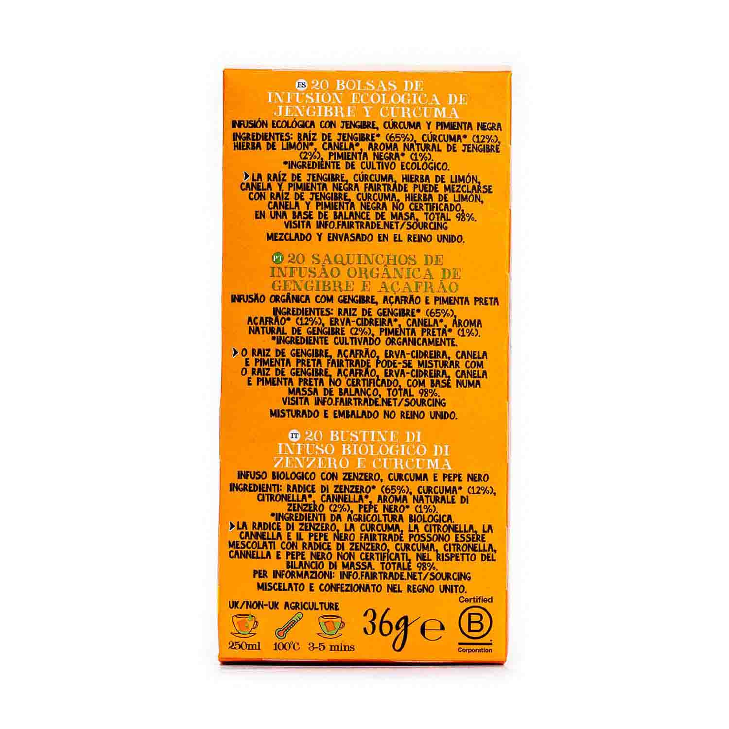 Raíz de jengibre* (65%), cúrcuma* (12%), hierba de limón*, canela*, aroma natural de jengibre (2%), pimienta negra*(1%).