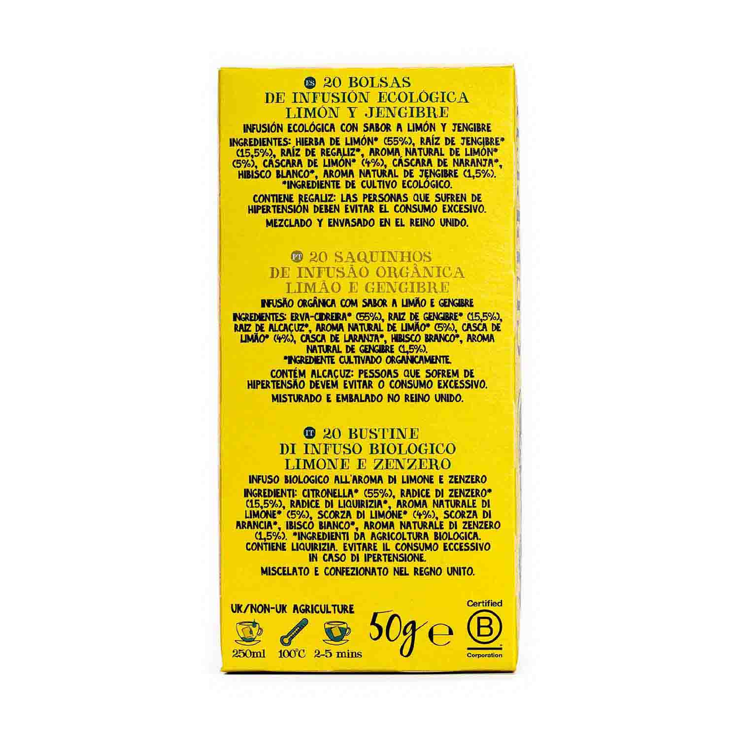Hierba de limón* 55%, raíz de jengibre* 15,5%, raíz de regalíz*, aroma natural de limón* 5%, cáscara de limón* 4%, cáscara de naranja*, hibisco blanco*, aroma natural de jengibre 1,5%.