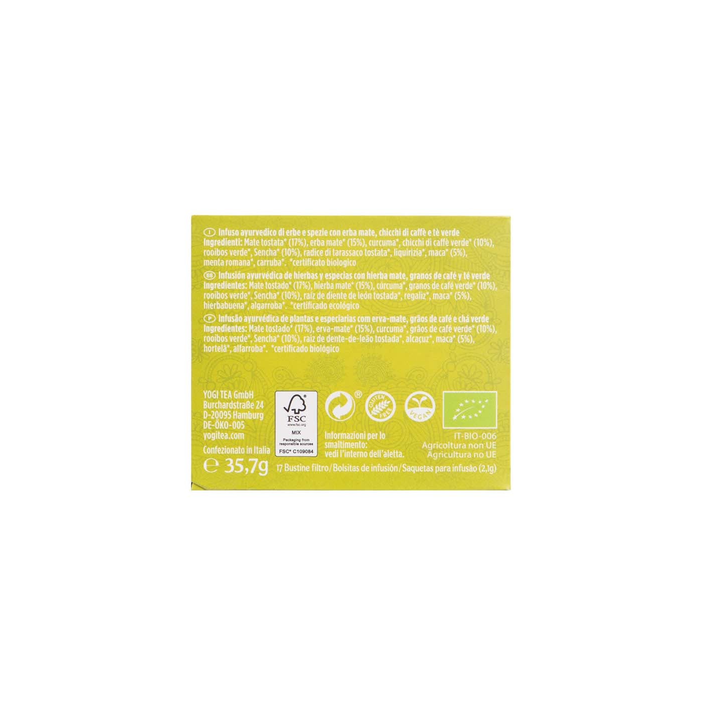 Mate tostado* (17%), hierba mate* (15%), cúrcuma*, granosde café verde* (10%), rooibos verde*, Sencha* (10%), raíz de diente deleón tostada*, regaliz*, maca* (5%), hierbabuena*, algarroba*.