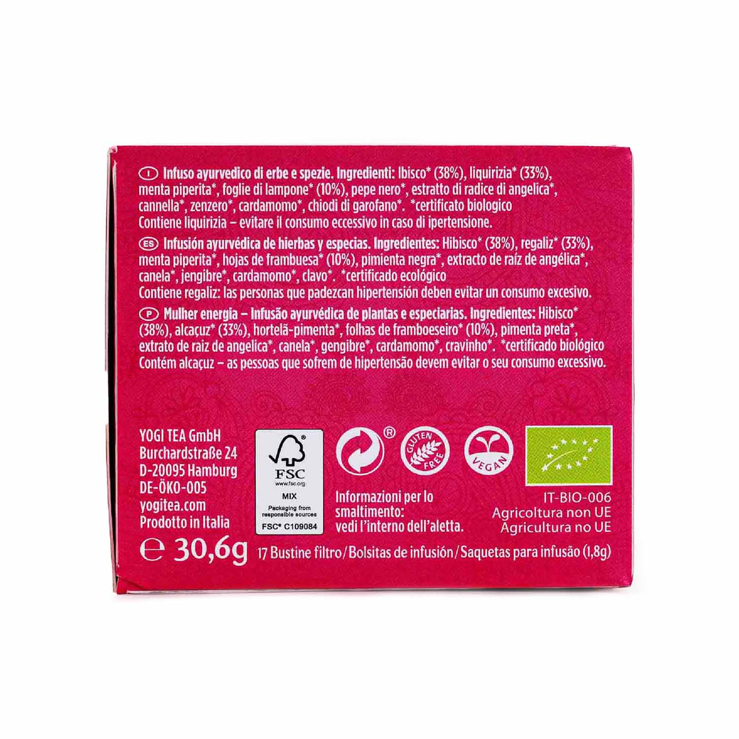Esta infusión utiliza ingredientes como el hibisco, el regaliz y las hojas de frambuesa, que son utilizados en la naturopatía. Además, contiene menta piperita, pimienta negra, extracto de raíz de angélica, canela, jengibre, cardamomo y clavo, todos ellos ingredientes orgánicos certificados.
