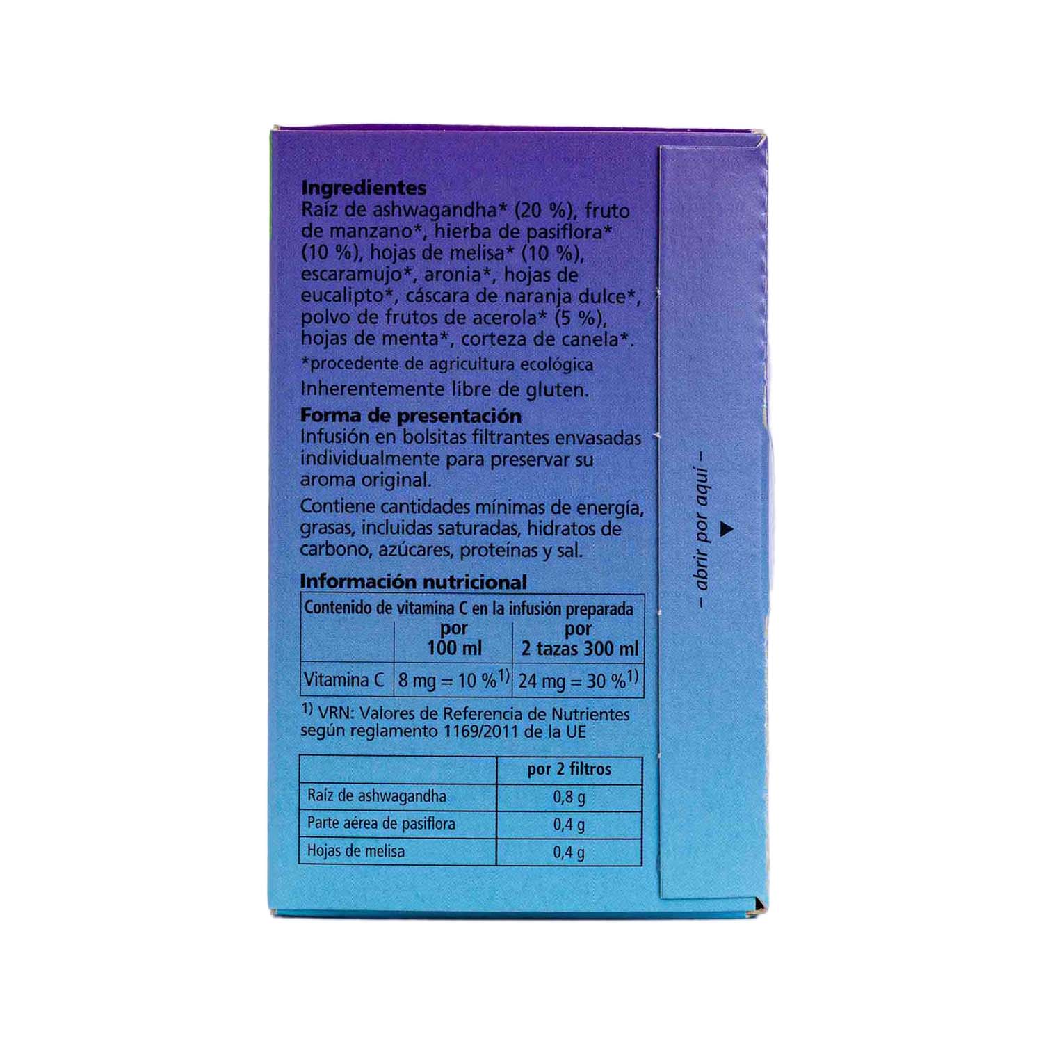 Esta infusión de origen ecológico contiene raíz de ashwagandha, también conocida como hierba del sueño o ginseng indio y es apreciada por sus propiedades adaptógenas además de equilibrantes y ha demostrado ser beneficiosa en situaciones de estrés nervioso, ya que ayuda a mantener el equilibrio interno. La infusión además contiene otras plantas entre las que destacan pasiflora y melisa por sus propiedades relajantes y que ayudan a conciliar el sueño. La mezcla se complementa con vitamina C natural procedente de acerola que contribuye al normal funcionamiento del sistema nervioso y a una función psicológica normal.