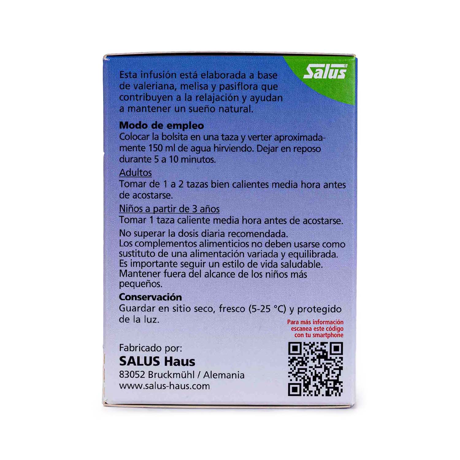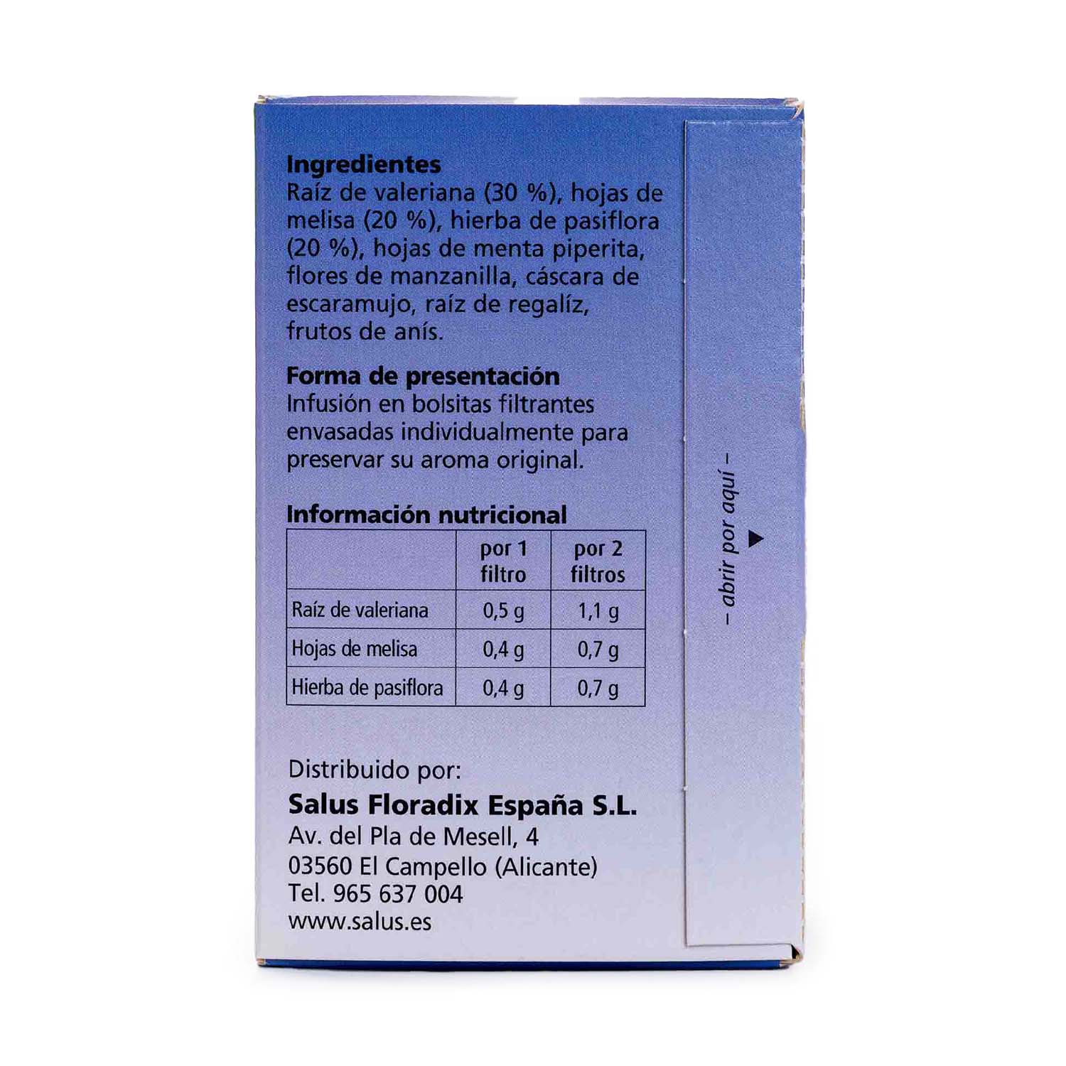 La infusión Salusan está elaborada a base de valeriana, melisa y pasiflora que favorecen la relajación y ayudan a mantener un sueño natural. Además contiene menta, manzanilla, regaliz, anís y escaramujo.