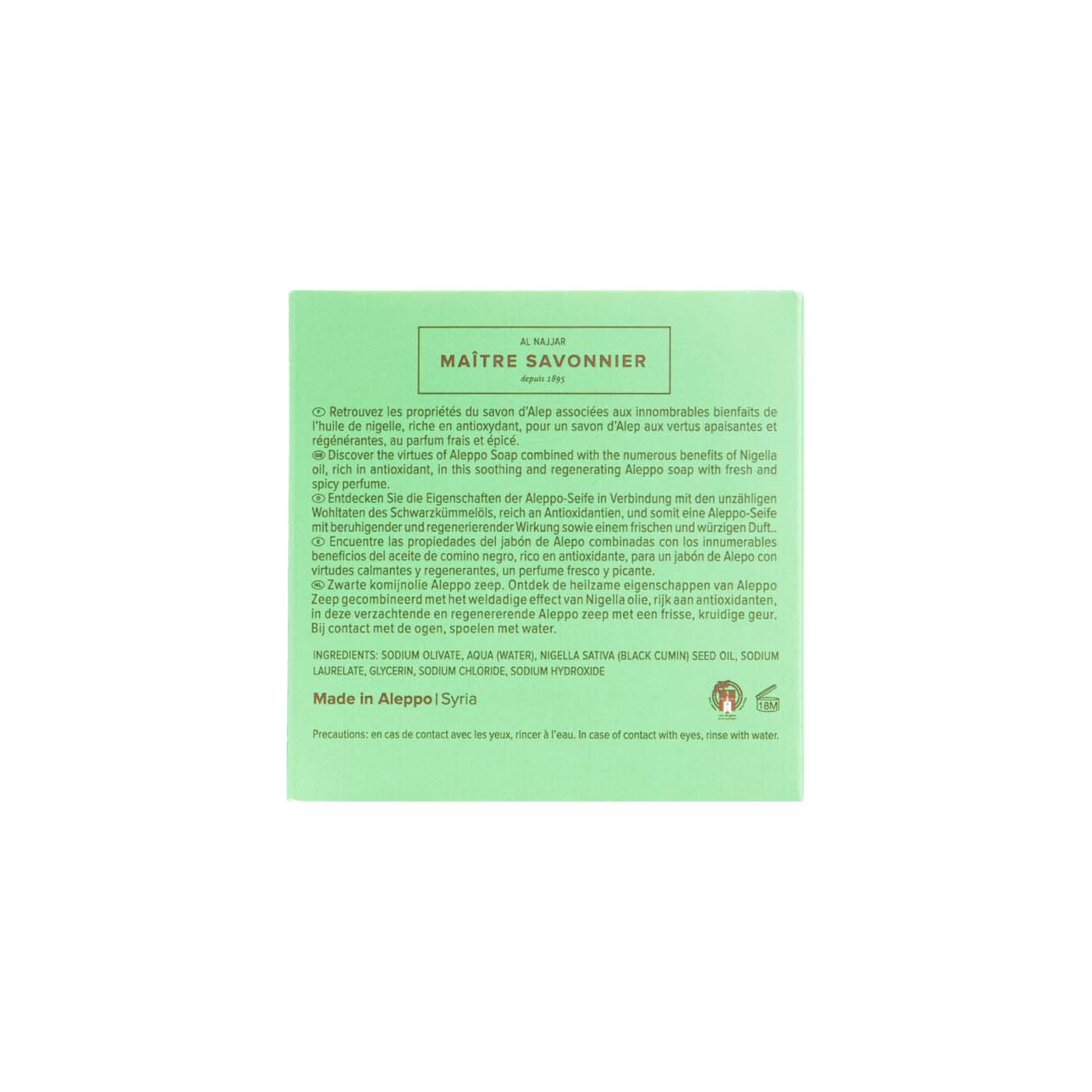 ¡Cuidado tradicional y bienestar diario para tu piel! El Jabón sólido de Alepo con Comino Negro de Najel ofrece una fragancia con notas ligeramente picantes y herbales procedentes del comino negro, combinadas con el suave y característico olor del aceite de oliva y laurel. Este jabón ofrece alivio y calma a las pieles más irritadas.