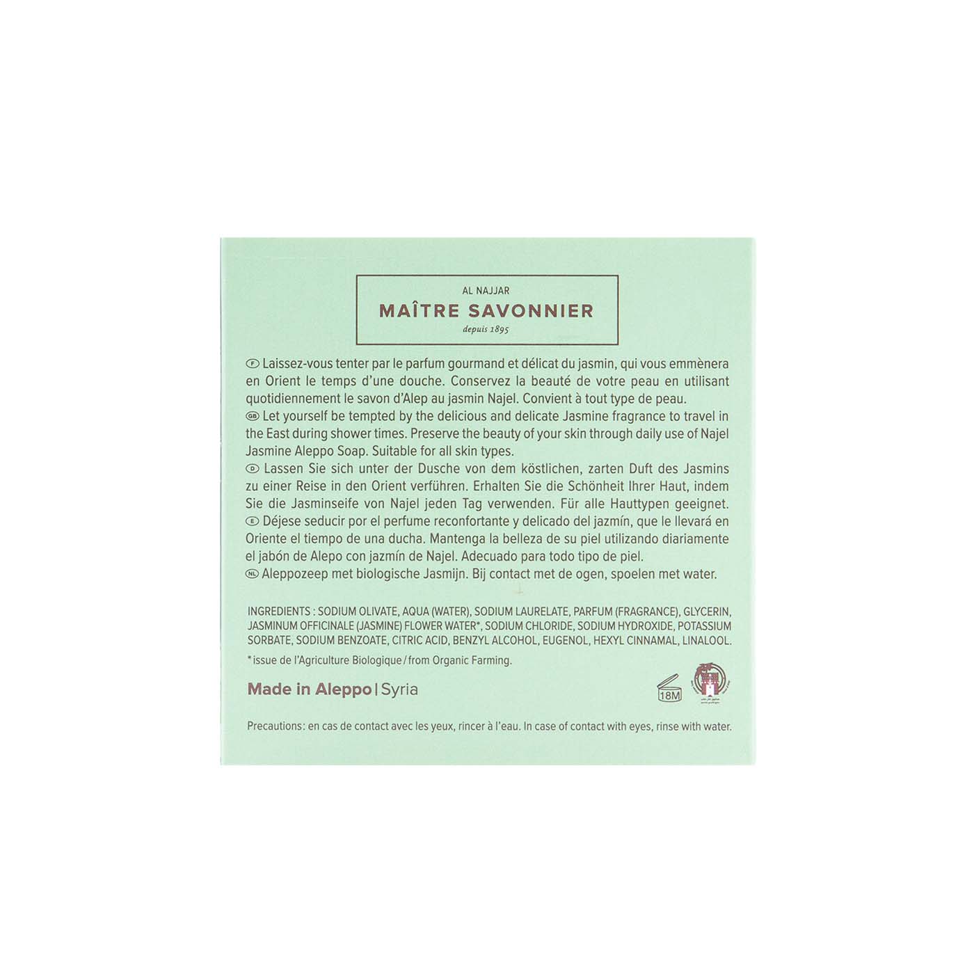 Producto de cuidado de la piel y del cabello perfecto para el uso diario, permitiendo disfrutar del aroma embriagador del jazmín mientras se mima la piel y el cabello. Está elaborado con aceite de oliva virgen orgánico y aceite de laurel, siguiendo la receta tradicional del jabón de Alepo.
