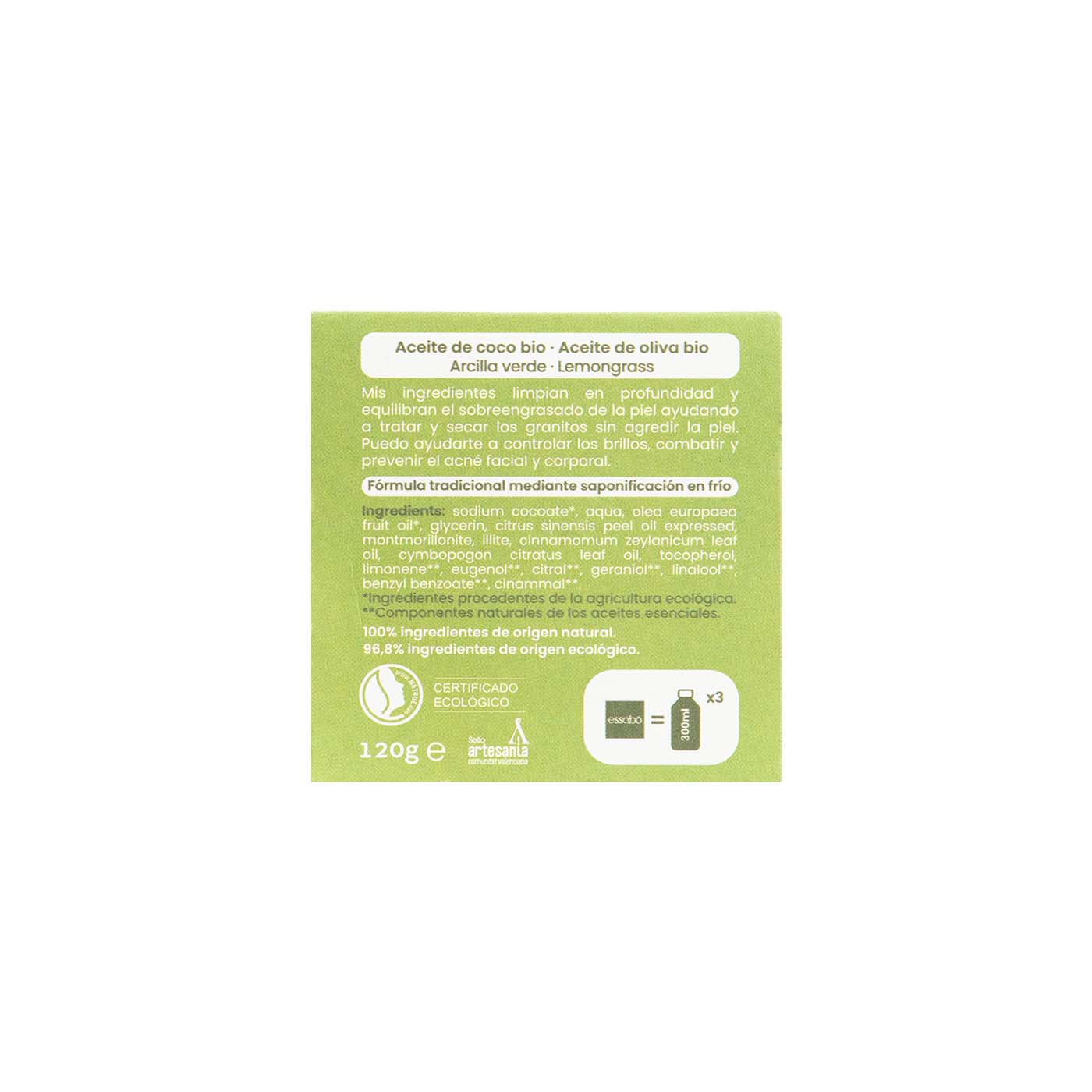 La arcilla verde se caracteriza por su efecto purificante y antibacteriano, ya que limpia en profundidad y produce un efecto relajante, aportando elasticidad y sensación de frescor en la piel. Además, ayuda a eliminar los puntos negros, tratar los poros abiertos y secar los granitos, ayudando a su desapación. Es un ingrediente funcional para combatir el acné y cualquier alteración como consecuencia del sobreengrasado de la piel. La mezcla de aceites esenciales de naranja, canela y lemongrass le aporta un fresco y agradable aroma. Esta composición única tiene actividad antifúngica, antimicrobiana y antiséptica generando un efecto astringente en la piel, calmando irritaciones y cicatrizando erupciones propias del acné. También ayudan en la acción del jabón, pues limpian y contraen los poros para trabajar contra el acné de forma eficaz. El jabón de aceite de coco es ideal como cosmético para la higiene personal. Genera una espuma abundante y suave que, junto con las propiedades suavizantes e hidratantes del aceite de oliva, constituyen un jabón excelente para todo tipo de pieles, inclusive las más jóvenes, sensibles o atópicas.