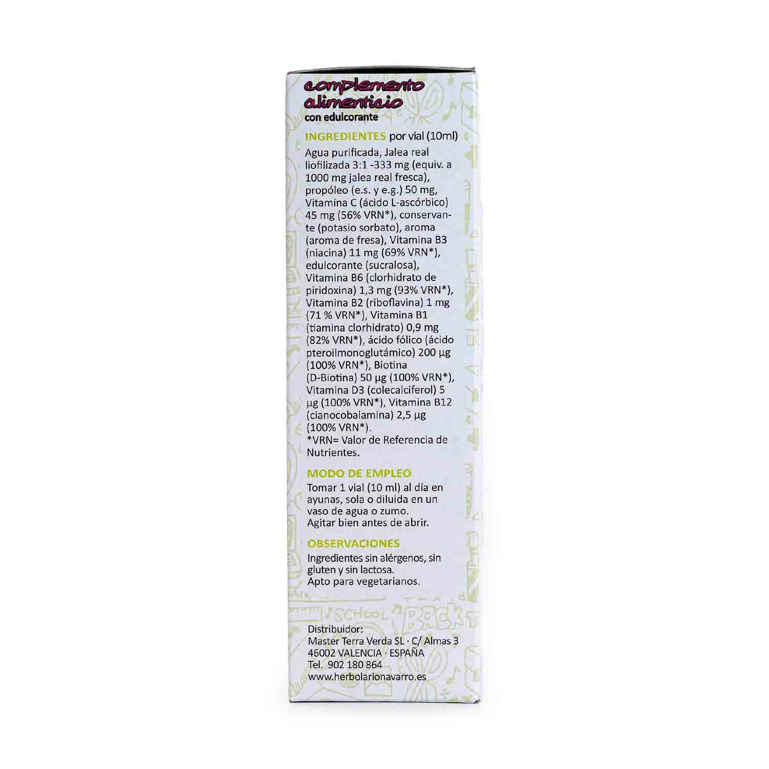 Agua purificada, Jalea real liofilizada 3:1 -333 mg (equiv. a 1000mg jalea real fresco), propóleo (e.s. y e.g.) 50 mg, Vitamina C (ácido L-ascórbico) 45mg (56% VRN*), conservante (potasio sorbato), aroma (aroma de fresa), Vitamina B3 (niacina) 11 mg (69% VRN*), edulcorante (sucralosa), Vitamina B6 (clorhidrato de piridoxina) 1,3 mg (93% VRN*), Vitamina B2 (riboflavina) 1mg (71% VRN*), Vitamina B1 (tiamina clorhidrato) 0,9 mg (82% VRN*), ácido fólico (ácido pteroilmonoglutámico) 200 µg (100% VRN*), Biotina (D-Biotina) 50 µg (100% VRN*), Vitamina D3 (colecalciferol) 5 µg (100% VRN*), Vitamina B12 (cianocobalamina) 2,5 µg (100% VRN*).