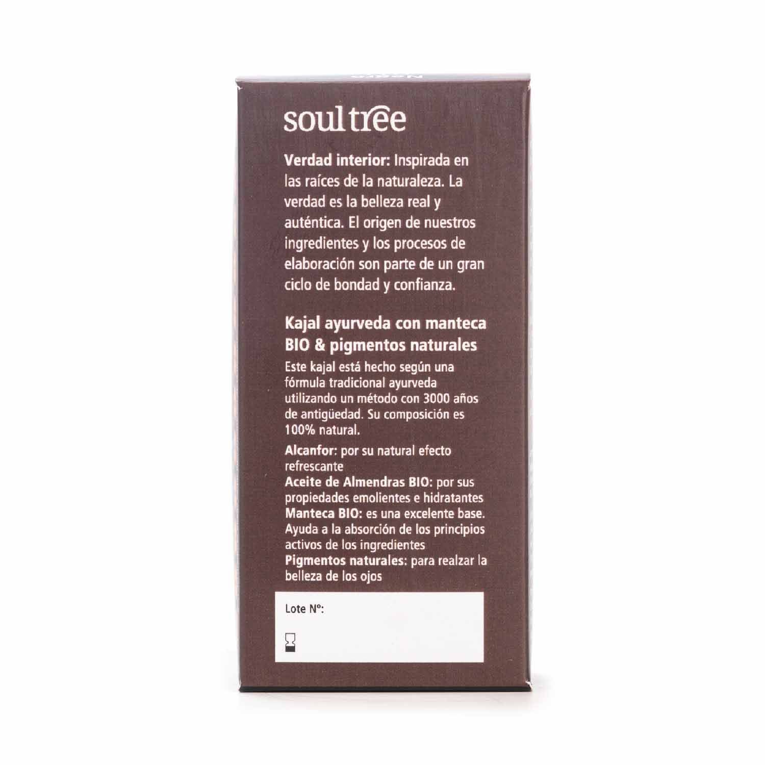 Kajal para los ojos de Soultree. Elaborado según la receta ayurvédica tradicional. Formulado con ghee orgánico, aceite de almendras orgánico y alcanfor. Belleza y protección natural para tus ojos. Sin plomo, sin metales pesados, sin colorantes sintéticos, sin derivados del petróleo, sin conservantes ni disolventes.