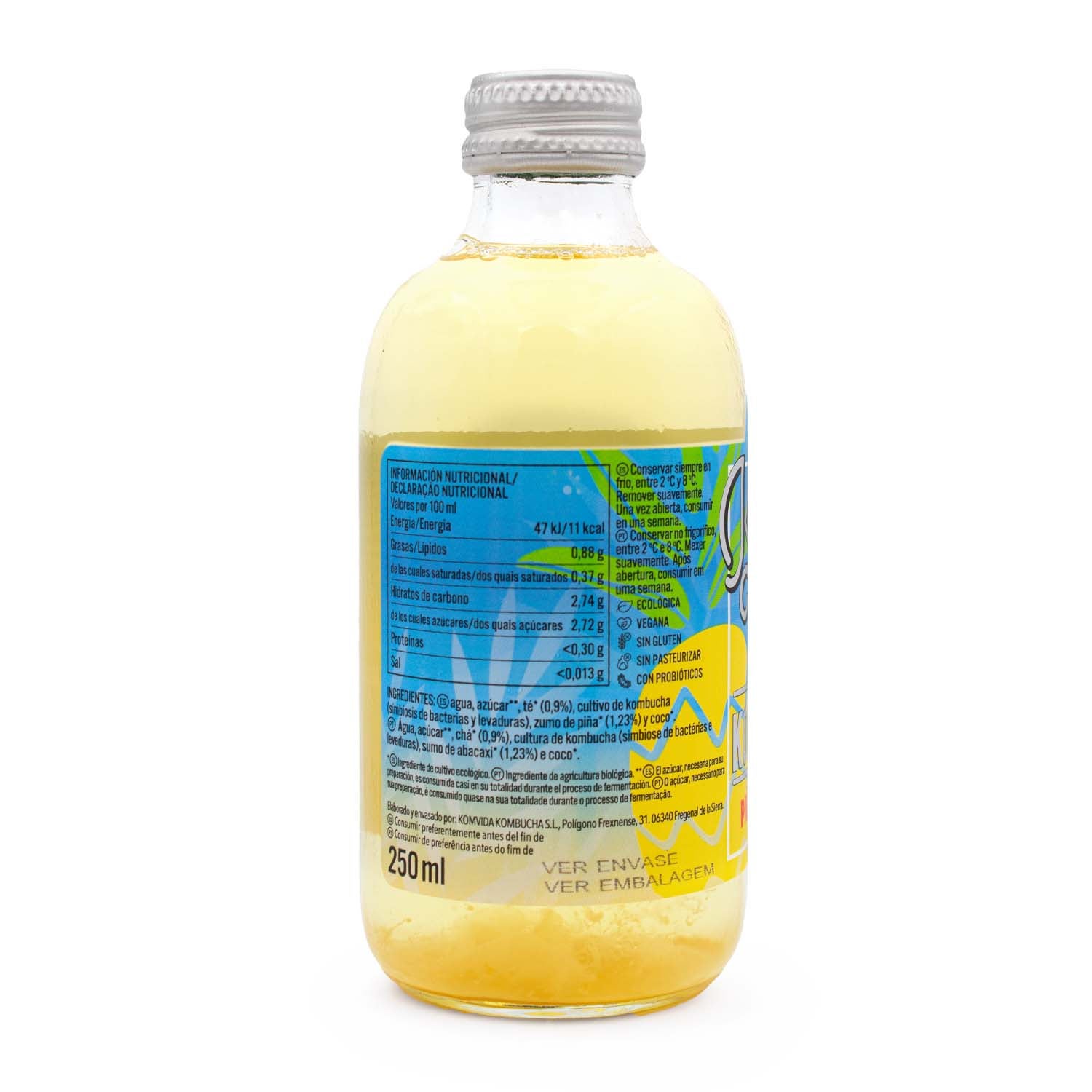 Agua, azúcar ecológica, té ecológico (0.9%), cultivo de kombucha ( simbiosis de bacterias y levaduras), zumo de piña ecológico (1,23%) y aroma de coco (0,012%).