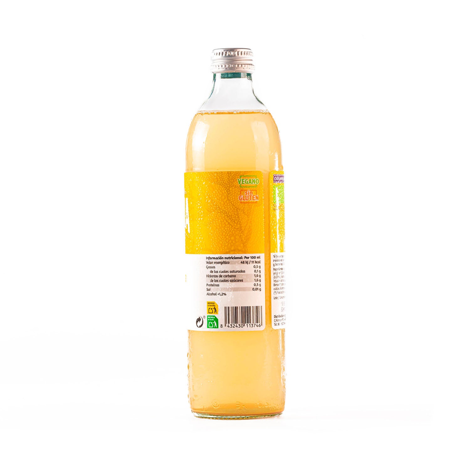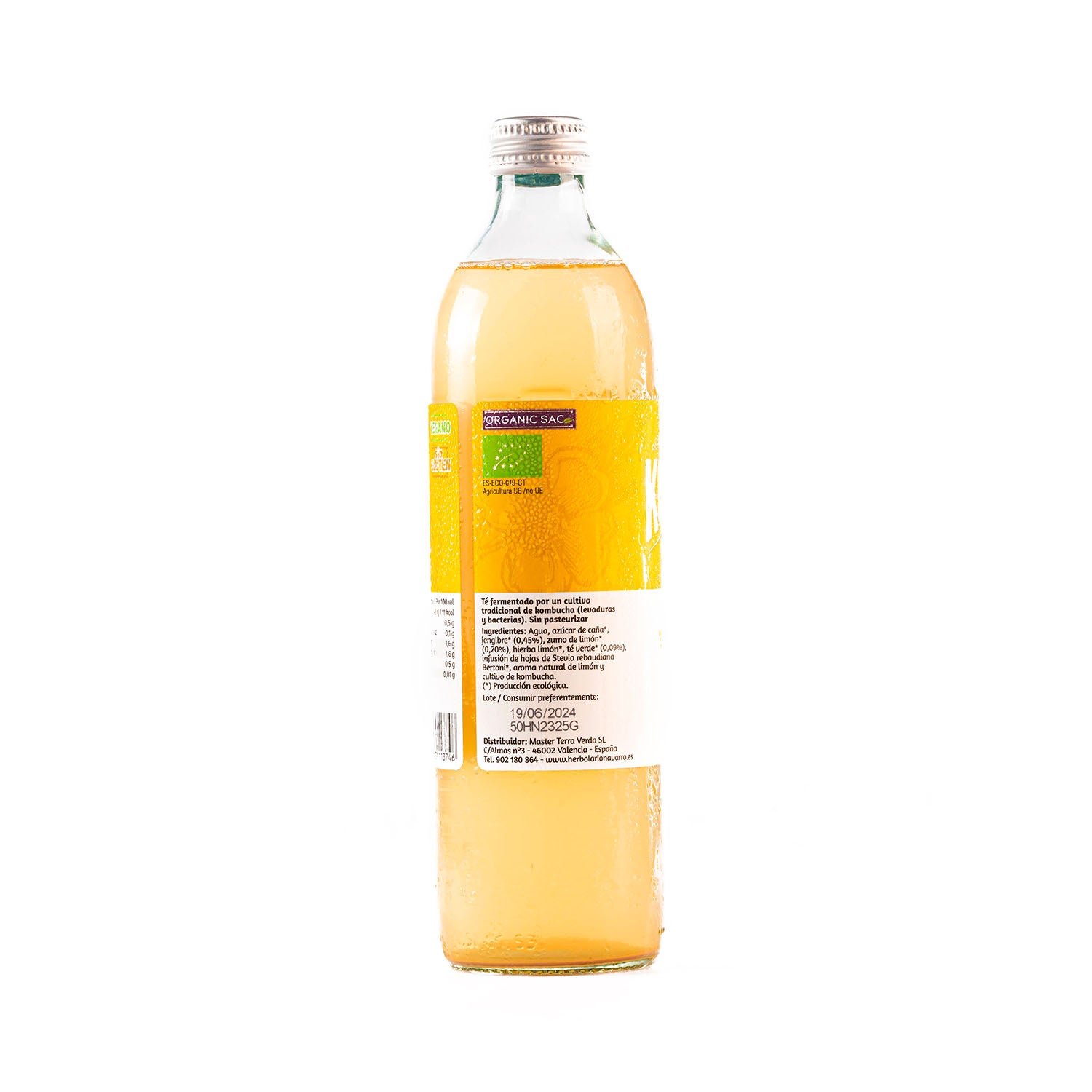 Agua, azúcar de caña, jengibre (0,45%), zumo de limón (0,20%), hierba limón, té verde (0,09%), infunsión de hojas de Stevia rebaudiana Bertoni, aroma natural de limón, cultivo de Kombucha. Contiene alcohol (< 1.2º). No pasteurizado. Sin gluten.
