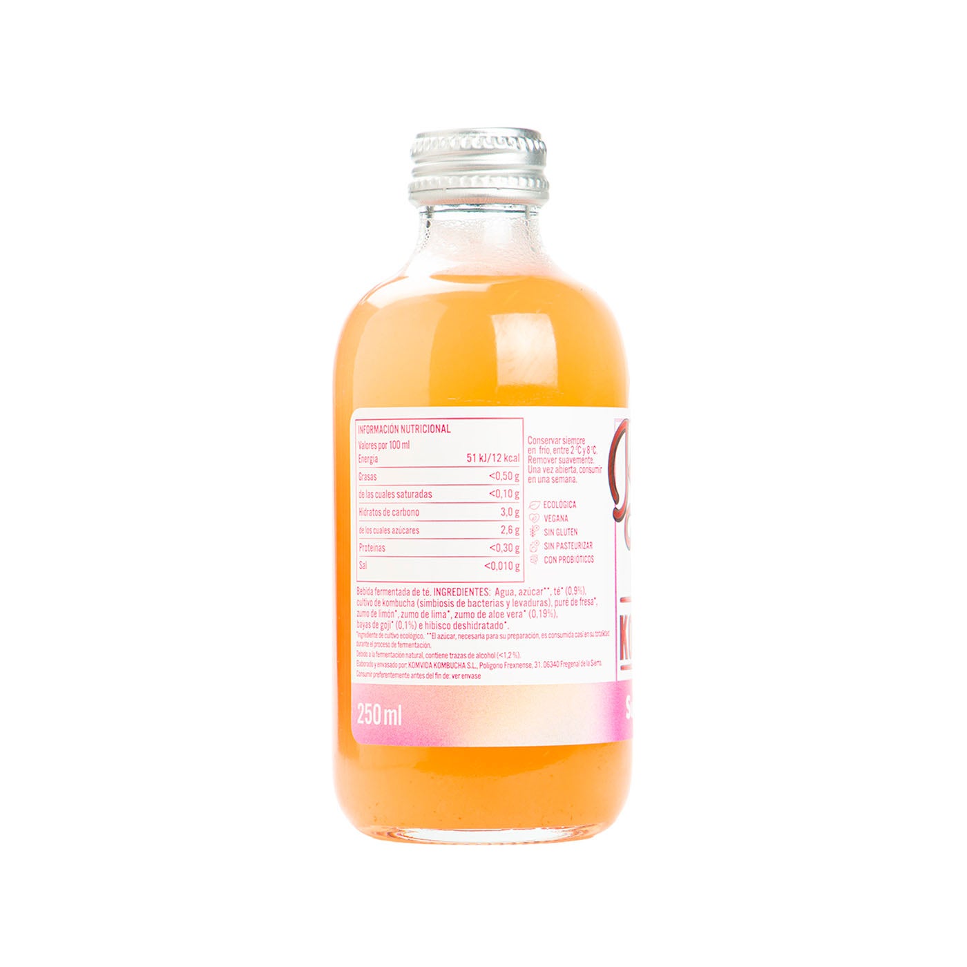 Agua, azúcar**, té* (0,9%), cultivo de kombucha (simbiosis de bacterias y levaduras), (0,9%) cultivo de kombucha (simbiosis de bacterias y levaduras), puré de fresa*, zumo de limón*, zumo de lima*, zumo de aloe vera* (0,19%), bayas de goji* (0,1%) e hibisco deshidratado. (*) De cultivo ecológico.