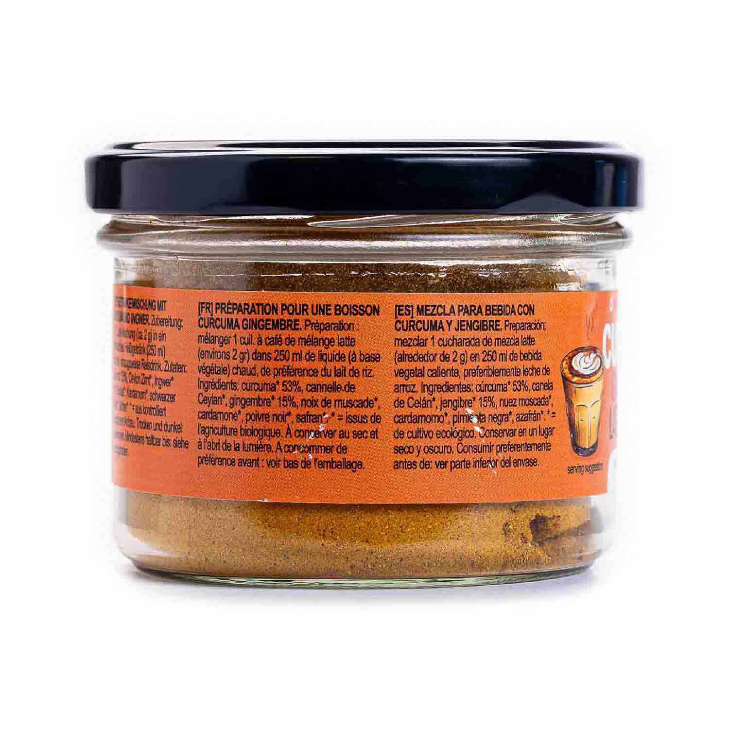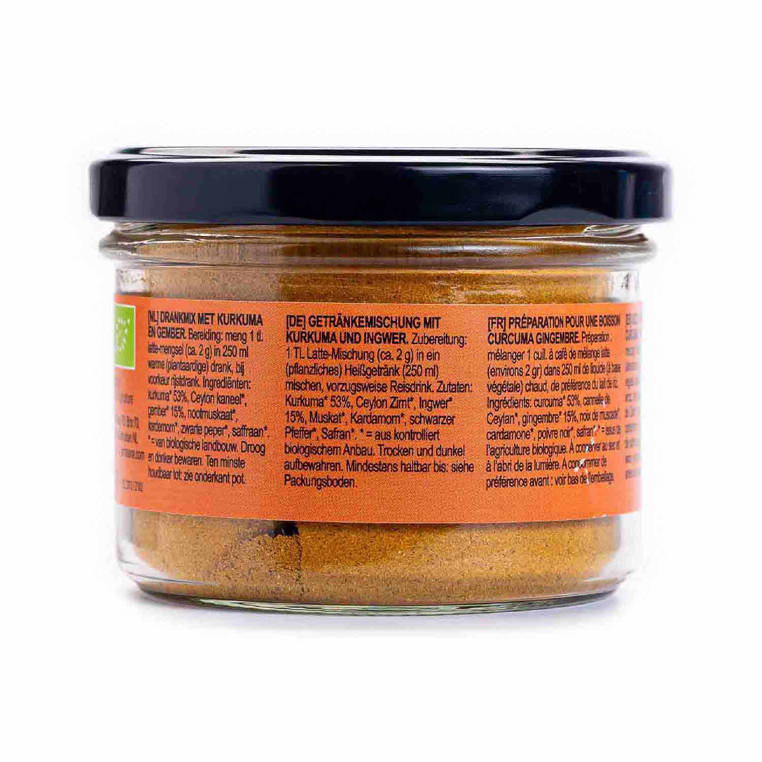 53% de cúrcuma *, canela de Ceilán *, 15% de jengibre *, nuez moscada *, cardamomo *, pimienta negra * * = de agricultura ecológica