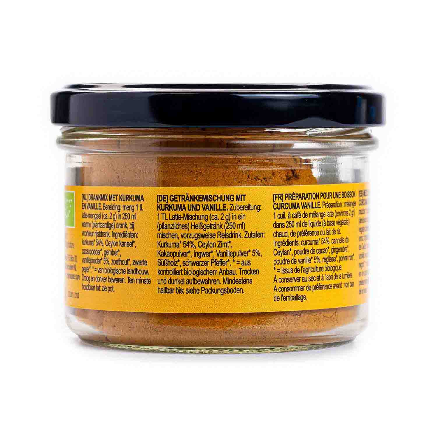 54% cúrcuma *, canela de Ceilán *, cacao en polvo *, jengibre *, 5% vainilla en polvo *, regaliz *, pimienta negra *