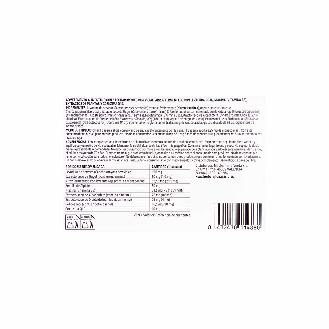 No superar la dosis diaria recomendada. Mantener fuera del alcance de los niños más pequeños. Los complementos alimenticios no deben utilizarse como sustituto de una dieta variada y equilibrada ni de un estilo de vida saludable. No debe ser consumido por mujeres embarazadas o en período de lactancia, niños y adolescentes menores de 18 años ni adultos mayores de 70 años. Si experimenta cualquier problema de salud, consulte a su médico sobre el consumo de este producto. No debe consumirse junto con medicación para reducir el colesterol. No debe consumirse si ya se consumen otros productos que contienen arroz fermentado con levadura roja. Un consumo excesivo puede causar malestar estomacal. Evitar el consumo con medicamentos y otros complementos alimenticios a base de fibra.