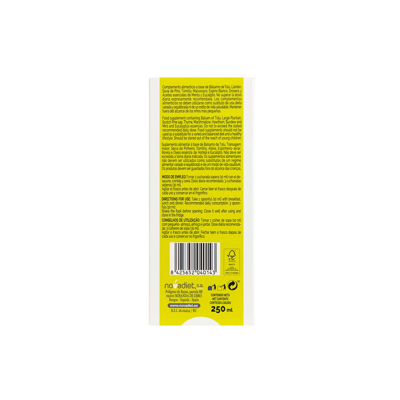 Complemento alimenticio en formato jarabe formulado con extractos naturales de plantas y esencias que contribuyen al bienestar del sistema respiratorio. Su composición incluye ingredientes como Bálsamo de Tolú, Llantén, Tomillo, Malvavisco, Savia de Pino, Espino Blanco, Drosera, Esencia de Menta y Esencia de Eucalipto.