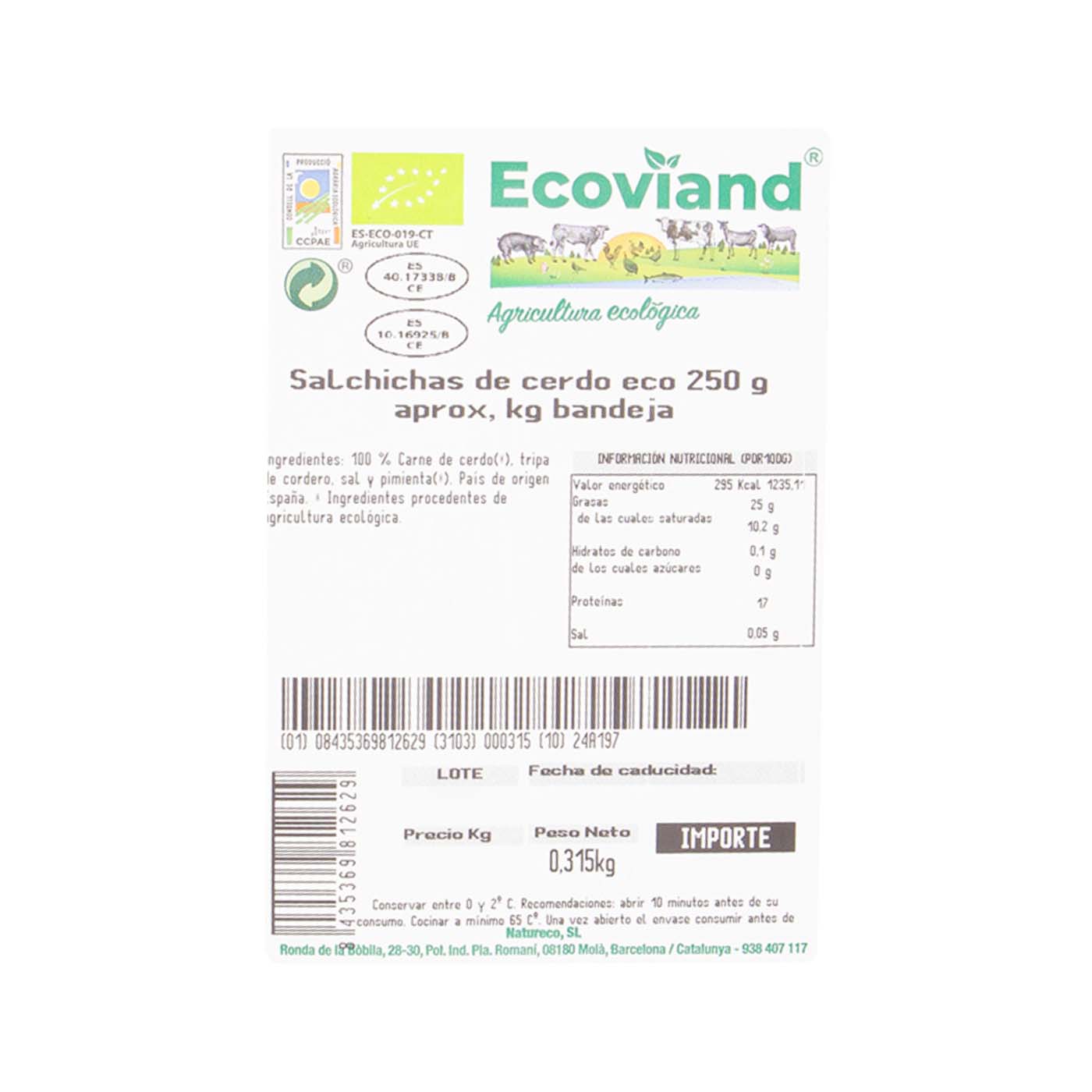 Cerdo bio* (100%), tripa de cordero*, sal* y pimienta negra* bio. (*) Ingredientes procedentes de agricultura ecológica