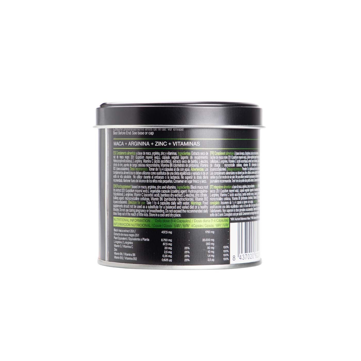 Extracto seco de raíz de maca negra 20:1 (Lepidium mayenii walp.), cápsula vegetal (agente de recubrimiento: Hidroxipropilmetilcelulosa), L-arginina, Vitamina C (ácido ascórbico), extracto seco de bambú, L-leucina, citrato de zinc, agente de carga: celulosa microcristalina, Vitamina B6 (clorhidrato de piridoxina), Vitamina B12 (cianocobalamina).