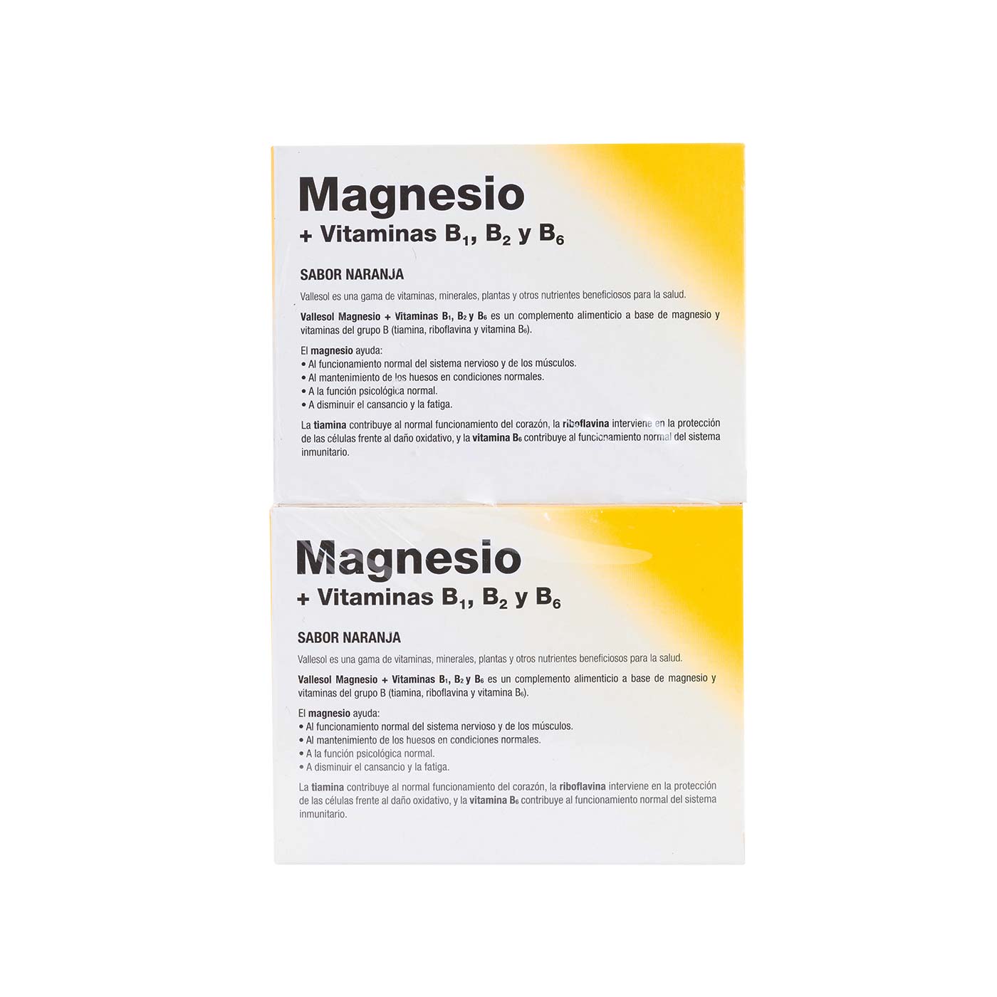 https://www.herbolarionavarro.es/magnesio-efervescente-con-vitaminas-pack-descuento-48comprimidos-vallesol78006Magnesio Efervescente con Vitaminas Pack Descuento 48comprimidos Vallesol<h2>¿Qué es el Magnesio efervescente con vitaminas B de Vallesol?</h2><p>Es un complemento alimenticio que combina magnesio y vitaminas del grupo B (B1, B2 y B6), nutrientes esenciales que desempeñan un papel crucial en el funcionamiento óptimo del sistema nervioso y muscular.</p><h2>¿Qué propiedades tiene Magnesio efervescente con vitaminas B de Vallesol?</h2><p>El magnesio, elemento fundamental en esta fórmula, ayuda al funcionamiento adecuado del sistema nervioso, participa en el correcto desempeño muscular y es esencial para el mantenimiento de huesos fuertes. Además, el magnesio tiene un efecto positivo en la función psicológica, contribuyendo a reducir la fatiga y el cansancio. Las vitaminas B presentes en este complemento también desempeñan un rol importante. La vitamina B1 contribuye al funcionamiento normal del corazón, mientras que la vitamina B2 actúa como antioxidante, protegiendo las células contra el daño oxidativo. Por su parte, la vitamina B6 refuerza el sistema inmunológico, manteniéndote en tu mejor estado.</p><h2>Modo de empleo</h2><p>Disolver un comprimido efervescente en agua y consumirlo una vez al día, de preferencia al despertar o en las primeras horas de la tarde. No exceder la dosis diaria recomendada es esencial para garantizar un uso seguro y efectivo. Advertencias Es importante destacar que, como en cualquier complemento alimenticio, se recomienda precaución. Las personas bajo control médico, las mujeres embarazadas o en período de lactancia deben consultar a su médico antes de tomar cualquier complemento. Además, este producto no está recomendado en casos de insuficiencia renal. Mantener fuera del alcance de los niños más pequeños.</p><h2 style="text-align: start; box-sizing: border-box; border-width: 0px; border-style: solid; border-color: rgba(229, 231, 235, var(--tw-border-opacity)); border-image: initial; --tw-border-spacing-x: 0; --tw-border-spacing-y: 0; --tw-translate-x: 0; --tw-translate-y: 0; --tw-rotate: 0; --tw-skew-x: 0; --tw-skew-y: 0; --tw-scale-x: 1; --tw-scale-y: 1; --tw-pan-x: ; --tw-pan-y: ; --tw-pinch-zoom: ; --tw-scroll-snap-strictness: proximity; --tw-gradient-from-position: ; --tw-gradient-via-position: ; --tw-gradient-to-position: ; --tw-ordinal: ; --tw-slashed-zero: ; --tw-numeric-figure: ; --tw-numeric-spacing: ; --tw-numeric-fraction: ; --tw-ring-inset: ; --tw-ring-offset-width: 0px; --tw-ring-offset-color: #fff; --tw-ring-color: #3b82f680; --tw-ring-offset-shadow: 0 0 #0000; --tw-ring-shadow: 0 0 #0000; --tw-shadow: 0 0 #0000; --tw-shadow-colored: 0 0 #0000; --tw-blur: ; --tw-brightness: ; --tw-contrast: ; --tw-grayscale: ; --tw-hue-rotate: ; --tw-invert: ; --tw-saturate: ; --tw-sepia: ; --tw-drop-shadow: ; --tw-backdrop-blur: ; --tw-backdrop-brightness: ; --tw-backdrop-contrast: ; --tw-backdrop-grayscale: ; --tw-backdrop-hue-rotate: ; --tw-backdrop-invert: ; --tw-backdrop-opacity: ; --tw-backdrop-saturate: ; --tw-backdrop-sepia: ; --tw-border-opacity: 1; font-size: 1.5rem; font-weight: 700; margin: 2em 0px 1em; line-height: 1.33333; color: rgb(50, 50, 50); font-family: "Work Sans", ui-sans-serif, sans-serif, system-ui, -apple-system; font-style: normal; font-variant-ligatures: normal; font-variant-caps: normal; letter-spacing: normal; orphans: 2; text-align: start; text-indent: 0px; text-transform: none; widows: 2; word-spacing: 0px; -webkit-text-stroke-width: 0px; white-space: normal; background-color: rgb(255, 255, 255); text-decoration-thickness: initial; text-decoration-style: initial; text-decoration-color: initial;"><strong>Advertencias</strong></h2><p style="text-align: start; box-sizing: border-box; border-width: 0px; border-style: solid; border-color: rgba(229, 231, 235, var(--tw-border-opacity)); border-image: initial; --tw-border-spacing-x: 0; --tw-border-spacing-y: 0; --tw-translate-x: 0; --tw-translate-y: 0; --tw-rotate: 0; --tw-skew-x: 0; --tw-skew-y: 0; --tw-scale-x: 1; --tw-scale-y: 1; --tw-pan-x: ; --tw-pan-y: ; --tw-pinch-zoom: ; --tw-scroll-snap-strictness: proximity; --tw-gradient-from-position: ; --tw-gradient-via-position: ; --tw-gradient-to-position: ; --tw-ordinal: ; --tw-slashed-zero: ; --tw-numeric-figure: ; --tw-numeric-spacing: ; --tw-numeric-fraction: ; --tw-ring-inset: ; --tw-ring-offset-width: 0px; --tw-ring-offset-color: #fff; --tw-ring-color: #3b82f680; --tw-ring-offset-shadow: 0 0 #0000; --tw-ring-shadow: 0 0 #0000; --tw-shadow: 0 0 #0000; --tw-shadow-colored: 0 0 #0000; --tw-blur: ; --tw-brightness: ; --tw-contrast: ; --tw-grayscale: ; --tw-hue-rotate: ; --tw-invert: ; --tw-saturate: ; --tw-sepia: ; --tw-drop-shadow: ; --tw-backdrop-blur: ; --tw-backdrop-brightness: ; --tw-backdrop-contrast: ; --tw-backdrop-grayscale: ; --tw-backdrop-hue-rotate: ; --tw-backdrop-invert: ; --tw-backdrop-opacity: ; --tw-backdrop-saturate: ; --tw-backdrop-sepia: ; --tw-border-opacity: 1; margin: 0px 0px 0.5rem; color: rgb(50, 50, 50); font-family: "Work Sans", ui-sans-serif, sans-serif, system-ui, -apple-system; font-size: 14px; font-style: normal; font-variant-ligatures: normal; font-variant-caps: normal; font-weight: 400; letter-spacing: normal; orphans: 2; text-align: start; text-indent: 0px; text-transform: none; widows: 2; word-spacing: 0px; -webkit-text-stroke-width: 0px; white-space: normal; background-color: rgb(255, 255, 255); text-decoration-thickness: initial; text-decoration-style: initial; text-decoration-color: initial;">No superar la dosis diaria recomendada. Mantener fuera del alcance de los niños más pequeños. Los complementos alimenticios no deben utilizarse como sustituto de una dieta variada y equilibrada ni de un estilo de vida saludable.</p><h2>Conservación</h2><p>Para conservar la calidad y efectividad del producto, asegúrate de almacenarlo en un lugar fresco y seco, lejos de la h