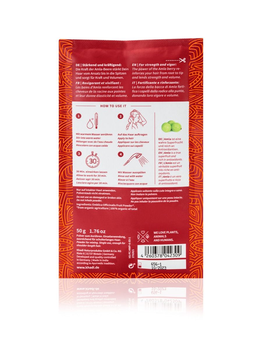 Mascarilla Capilar "The Power of Amla" en Polvo de Khadi. La mascarilla ayurvédica para el cabello The Power of Amla da volumen a tu cabello y previene el encanecimiento de forma completamente natural. Favorece el crecimiento del cabello nutriendo y fortaleciendo las raíces. Incluso las canas se benefician de la producción de melanina provocada por el poder de la baya Amla.