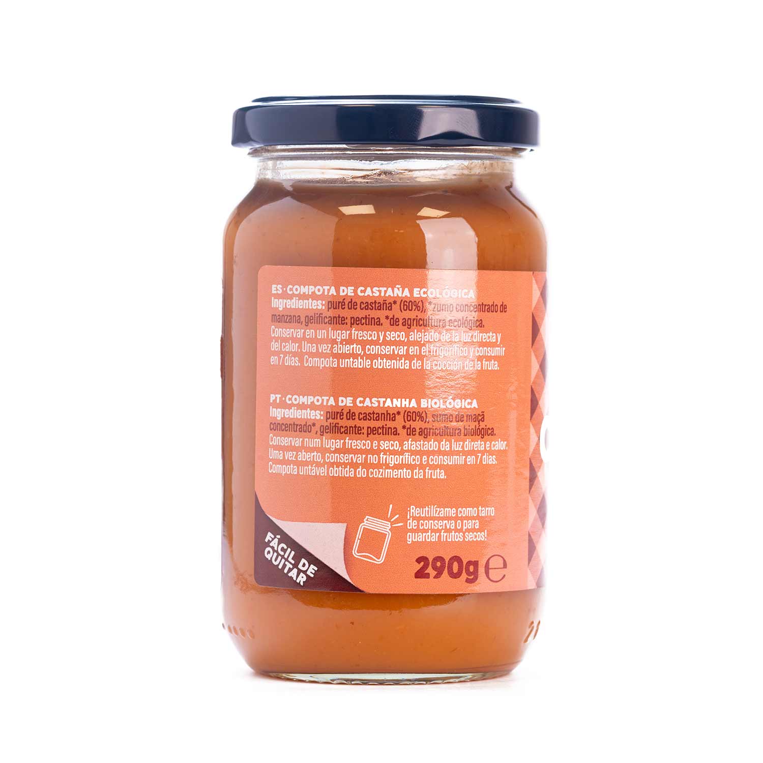 Es una deliciosa mezcla procedente de agricultura ecológica certificada, obtenida de la cocción de las mejores castañas y su combinación con zumo de manzana concentrado. Con un mínimo del 60% de fruta seleccionada, nuestra compota es una opción saludable y deliciosa para tu alimentación. Su fórmula sencilla y natural incluye castaña y zumo de manzana concentrado, todo procendente de cultivos ecológicos.