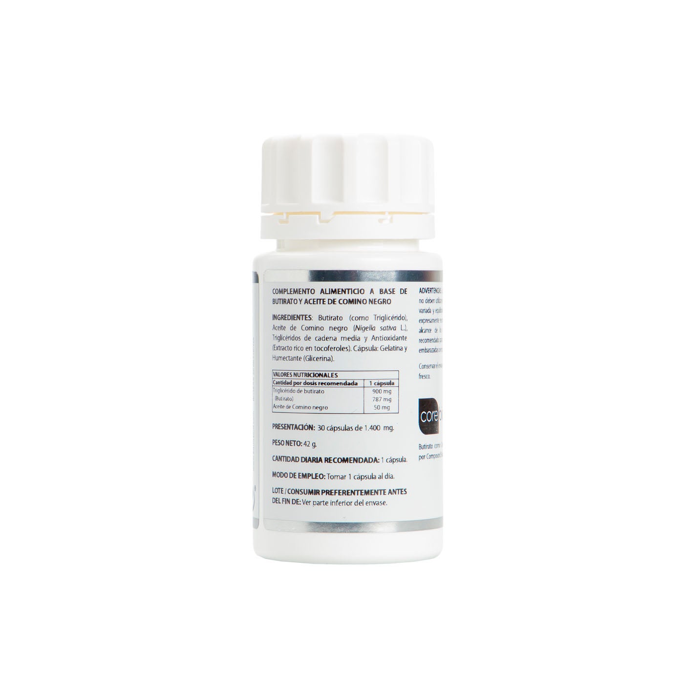 Por cápsula: Triglicérido de butirato* 900mg. (*De los cuales Butirato 787mg); aceite de comino negro (Nigella sativa L.) 50 mg.