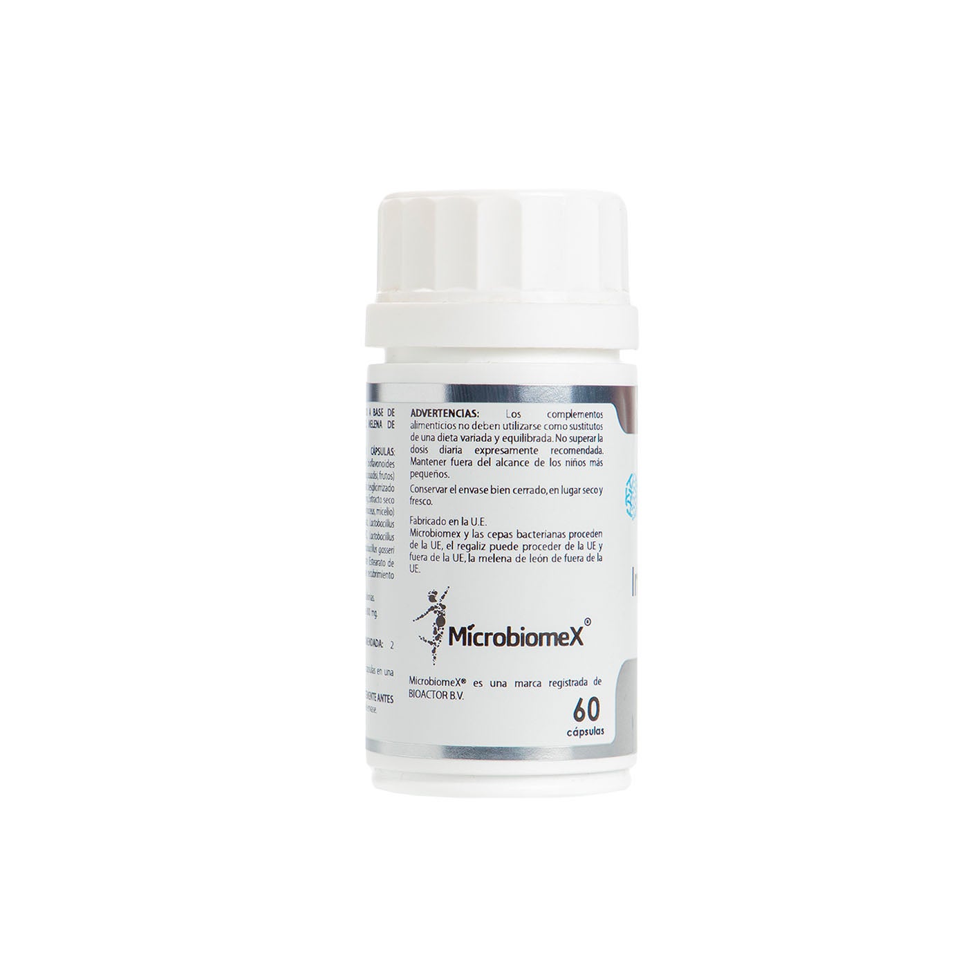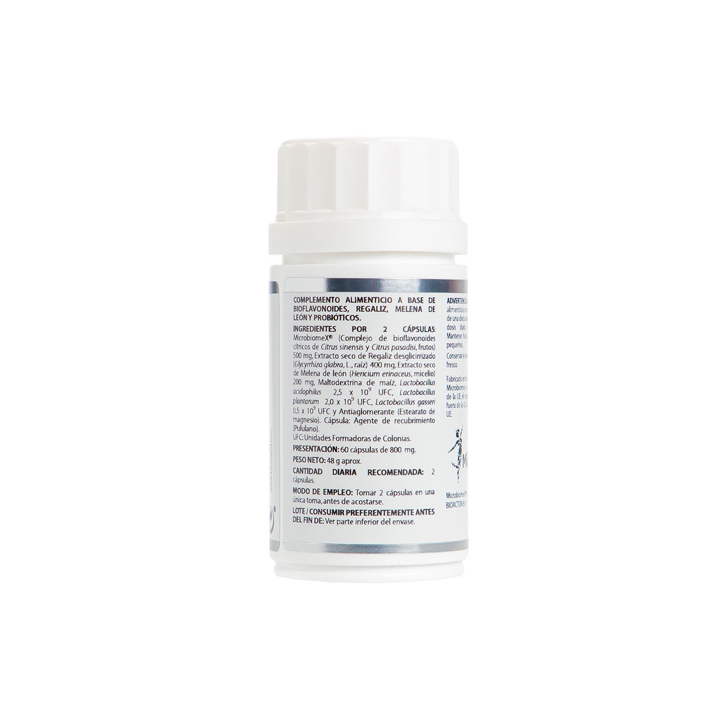 Microbiomex® (complejo de bioflavonoides cítricos (naranjo dulce (Citrus × sinensis Osbeck), pomelo (Citrus paradisi Macfad.)), 250 mg; regaliz desglicirrizado extracto seco (Glycyrrhiza glabra L.), 200 mg; melena de león extracto seco (Hericium erinaceus (Bull.) Persoon), 100 mg; Lactobacillus acidophilus LMG 8151 (2,5×1010 UFC/g), 50 mg; mezcla de probióticos Kilocontrol* (2,5x1010UFC/g), 50 mg; maltodextrina de maíz, c.s.