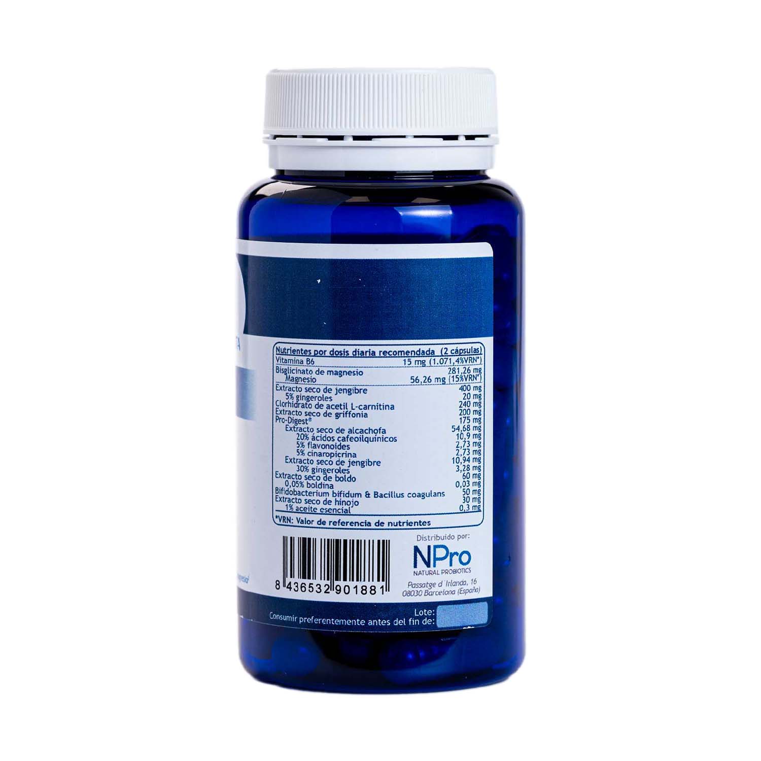 Por 2 cápsulas: Vitamina B6 15mg (1.071, 4%VRN*), Bisglicinato de magnesio 281,26mg de los cuales Magnesio 56,26mg (15%VRN*), extracto seco de jengibre 400mg de los cuales 5% gingeroles 20mg, Clorhidrato de acetil L-carnitina 200mg, Extracto seco de griffonia 175mg, Pro digest 54,68mg de los cuales [Extracto seco de alcachofa 10,9mg (20% ácidos cafeoilquinicos 2,75mg, 5% flavonoides 2,73mg, 5% cinaropicrina 10,94mg), extracto seco de jengibre 10,94mg (30% gingeroles 3,28mg)], extractos eco de boldo 60mg (0,05% boldina 0,03mg), bifidobacterium bifidum 50mg, extracto seco de hinojo 30mg (1% aceite esencial 0,3mg).