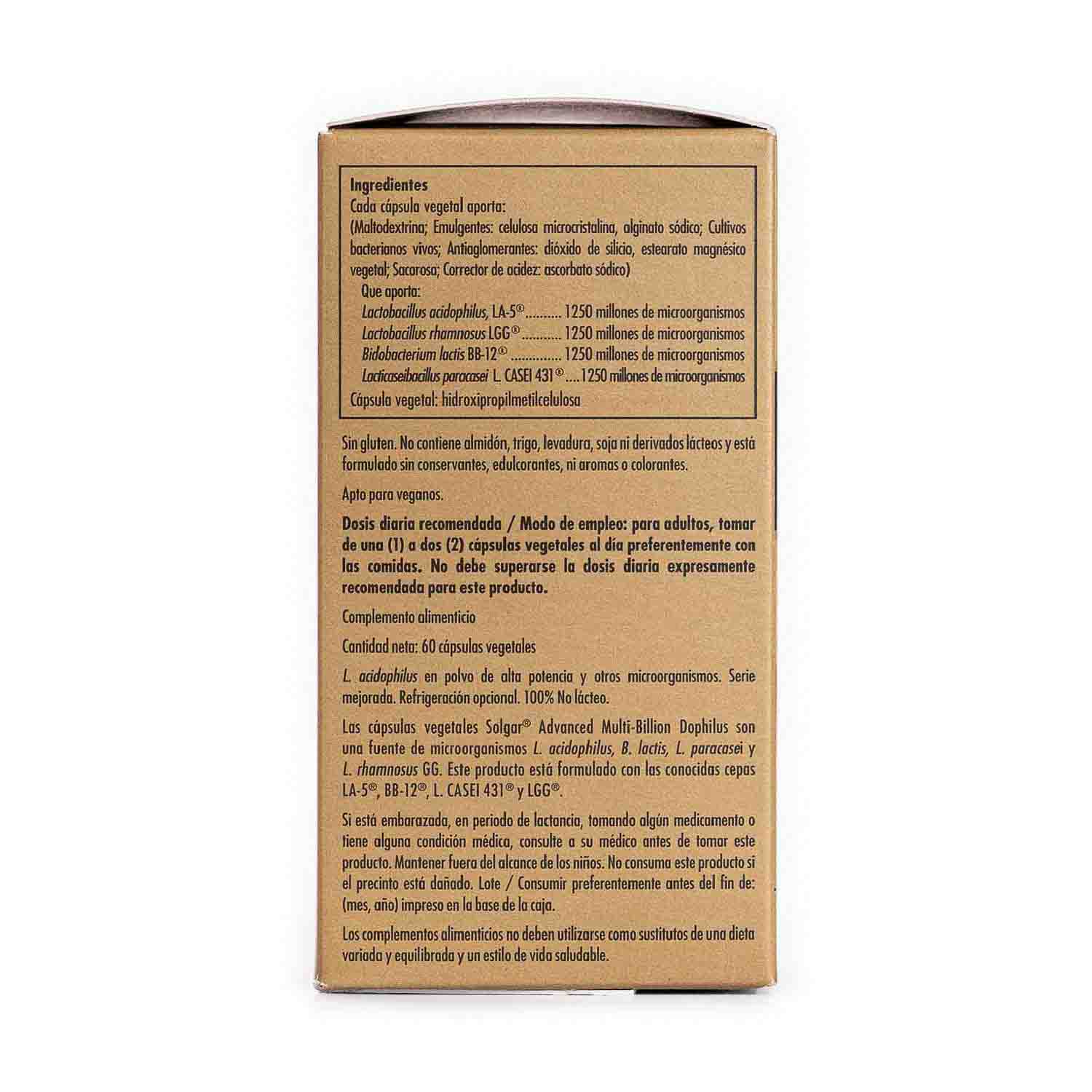 Multi-Billion Dophilus Avanzado de Solgar es una formulación no láctea con 4 cepas especialmente cultivadas aportando 5.000 millones de microorganismos, 1.250 millones de cada cepa.