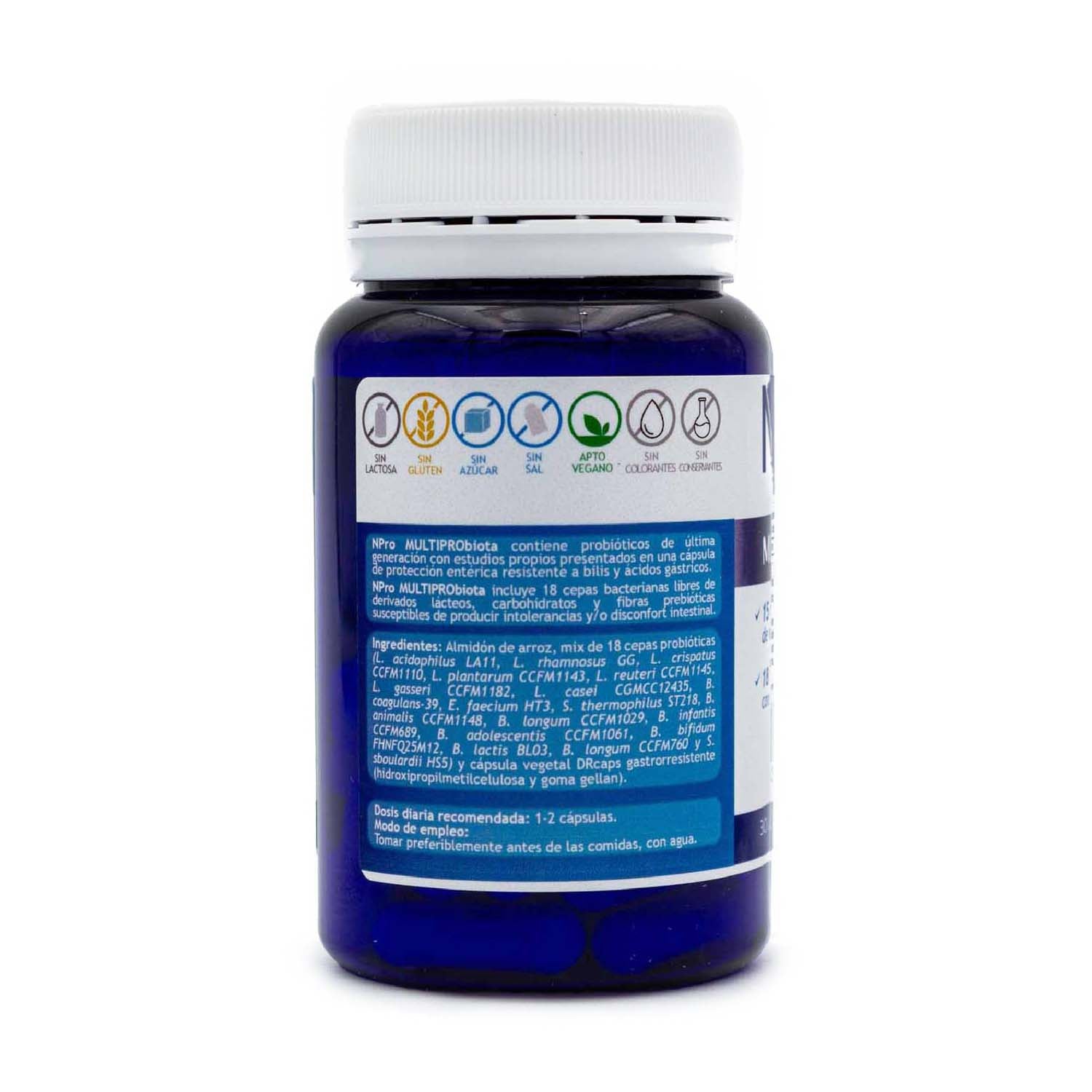 Multiprobiota NPro es un complemento alimenticio cuya fórmula contiene 18 cepas microbianas y 15,000 millones de ufc's por cápsula. Con sistema DR caps, es decir, cápsulas de lenta liberación y sin carbohidratos o fibras prebióticas para evitar intolerancias y disconfort. ¡Cuida tu microbiota!
