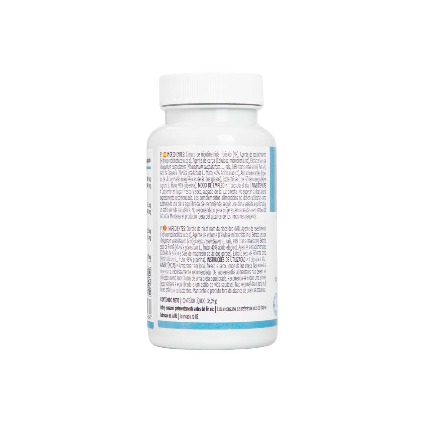 Cloruro de nicotinamida ribósido (NR), Agente de recubrimiento (Hidroxipropilmetilcelulosa), Agente de carga (Celulosa microcristalina), Extracto seco de Polygonum cuspidatum (Polygonum cuspidatum, L., raíz, 98% trans-resveratrol), Extracto seco de Granada (Punica granatum, L., fruto, 40% ácido elágico), Antiaglomerantes (Dióxido de silicio y Sales magnésicas de ácidos grasos), Extracto seco de Pimienta negra (Piper nigrum, L., fruto, 95% piperina)