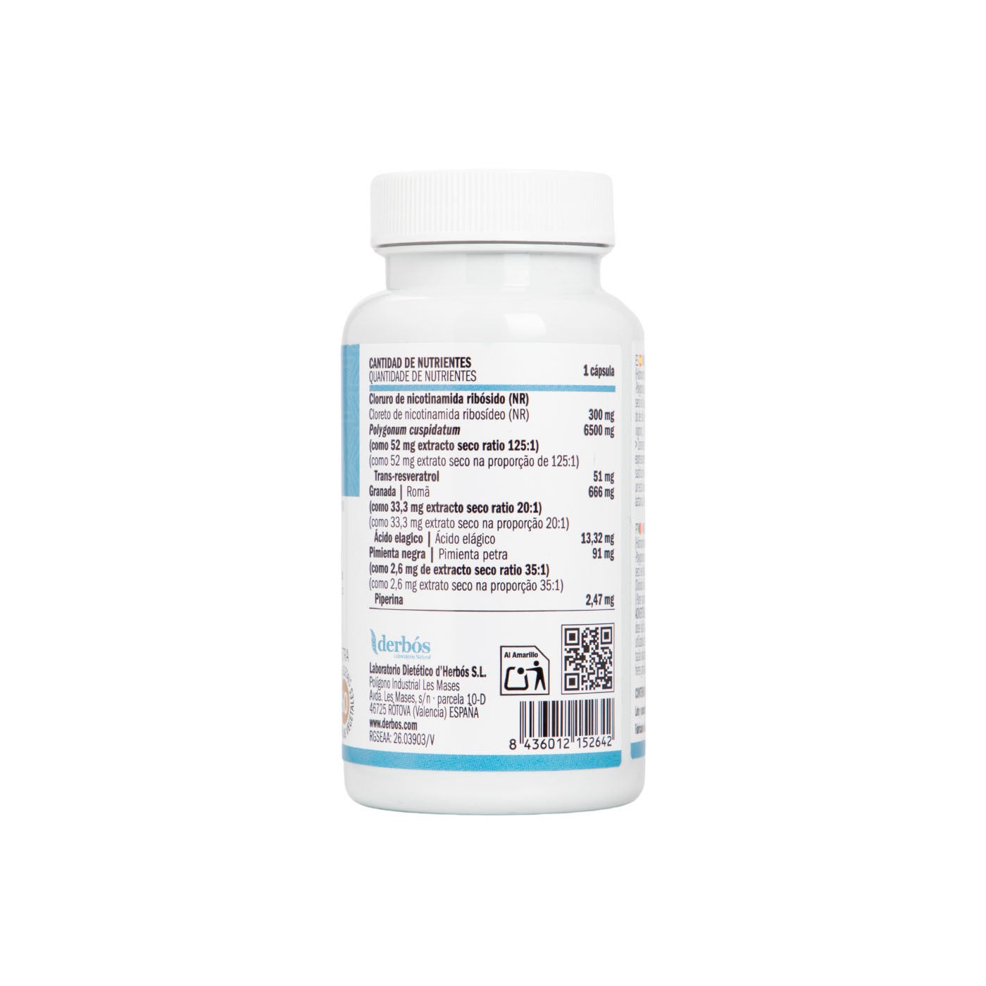 Este complemento alimenticio de Derbós, en formato de 60 cápsulas, combina NAD+ precursor y Trans-Resveratrol con extractos botánicos.