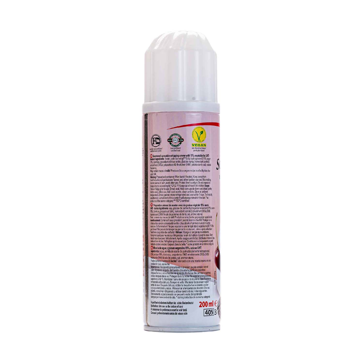 Agua, semilla de aceite de palma (totalmente hidrogenada, 15%), azúcar 10%, dextrosa, propelente: E942, emuslionante: E472e, E435, espesante: E454, fécula de patata, sal, aroma natural.