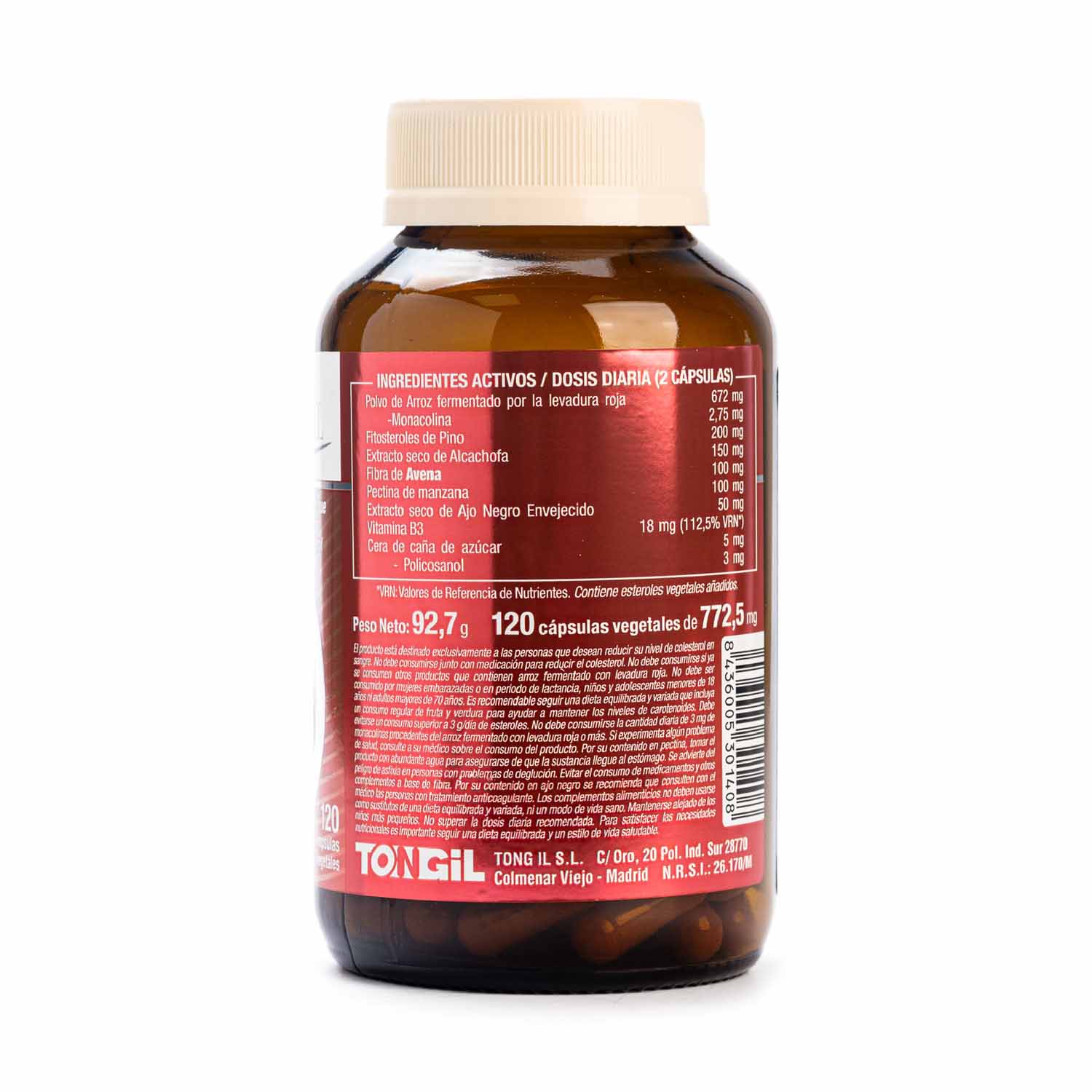 Nivelcol de Tongil. Complemento alimenticio a base de polvo de arroz fermentado por la levadura roja, fitosteroles, fibra de avena, pectina de manzana, alcachofa, ajo negro envejecido, vitamina B3 y cera de caña de Azúcar.