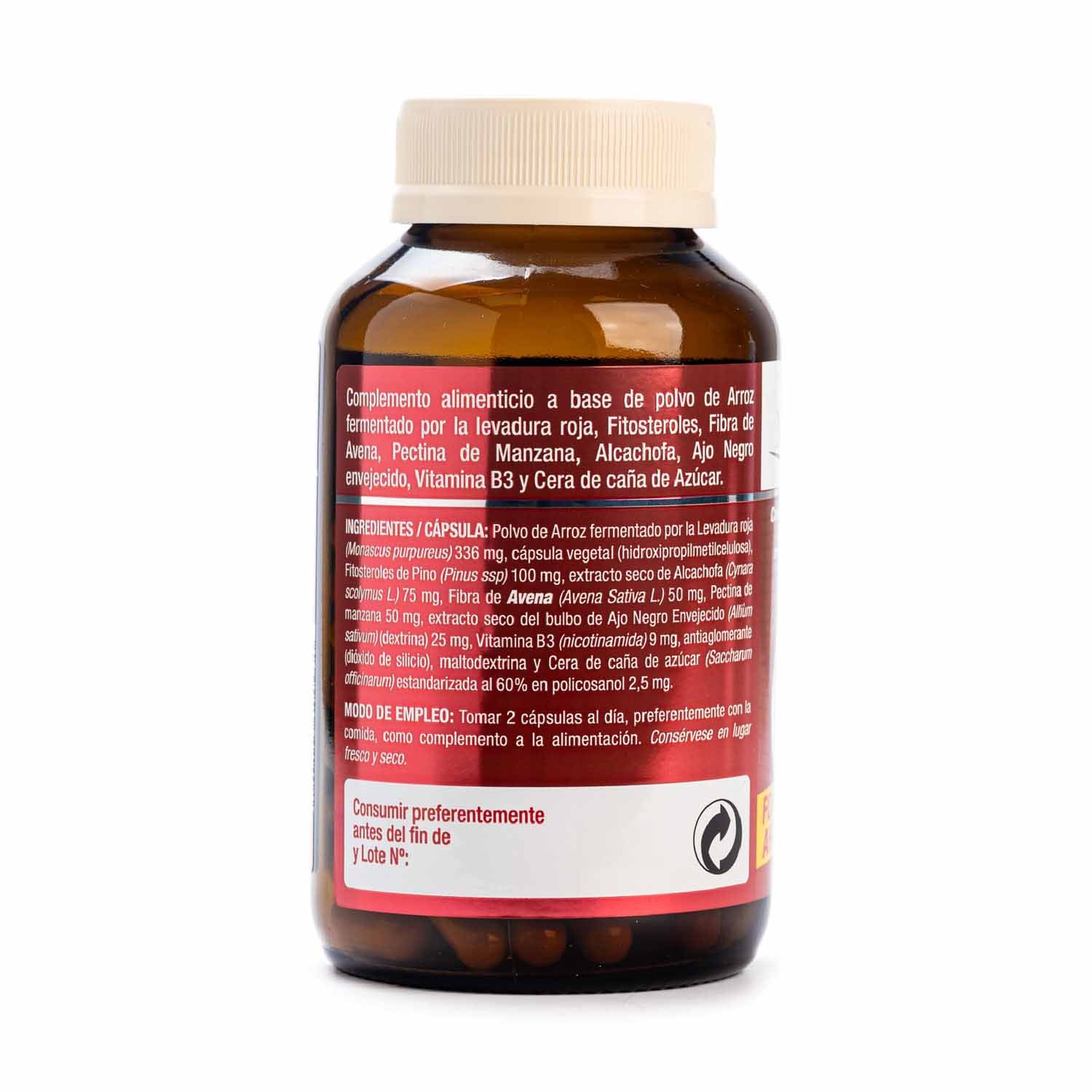 Polvo de arroz fermentado por la levadura roja (Monascus purpureus), Fitosteroles de Pino (Pinus spp.), Extracto seco de Alcachofa (Cynara scolymus L.) estandarizado al 2% en cinarina, Fibra de Avena (Avena sativa L.), Pectina de Manzana, extracto seco patentado del bulbo de ajo negro envejecido (Allium sativum) ABG10+® y estandarizado en S-Alil Cisteína (equivalente a 500 mg de bulbo de ajo fresco), Vitamina B3 (nicotinamida), Cera de Caña de Azúcar (Saccharum officinarum) rica en policosanol, Otros ingredientes: Cápsula vegetal, antiaglomerante (dióxido de silicio), maltodextrina y dextrina.