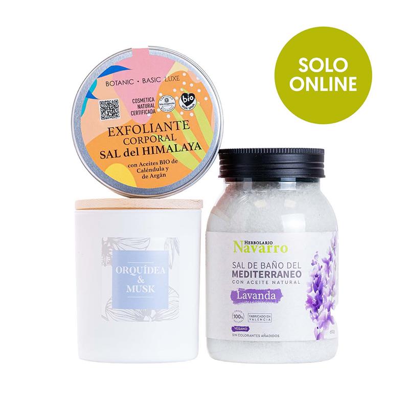 Mímate con nuestro pack mediterráneo que incluye unas sales de baño con aroma a lavanda, una vela de aroma oruídea y musk y un exfoliante corporal con sal Himalaya y aceites.