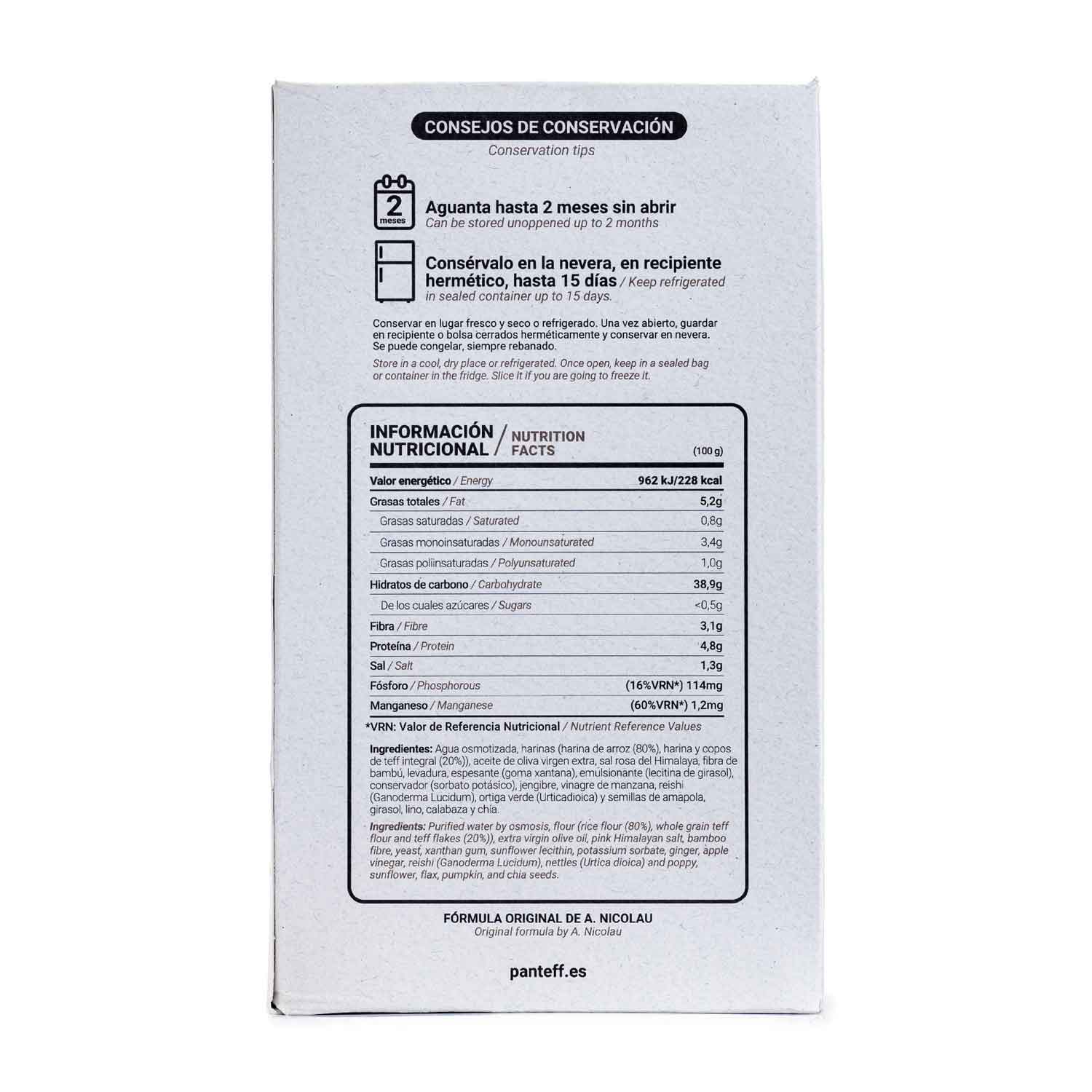 Agua osmotizada, harinas (harina de arroz (80%), harina y copos de teff integral (20%)), aceite de oliva virgen extra, sal rosa del Himalaya,, fibra de bambú, levadura, espesante (goma xantana), emulsionante (lecitina de girasol), conservador (sorbato potásico), jengibre, vinagre de manzana,, reishi (Ganoderma Lucidum), ortiga verde (Urticadioica) y semillas de amapola, girasol, lino, calabaza y chía.
