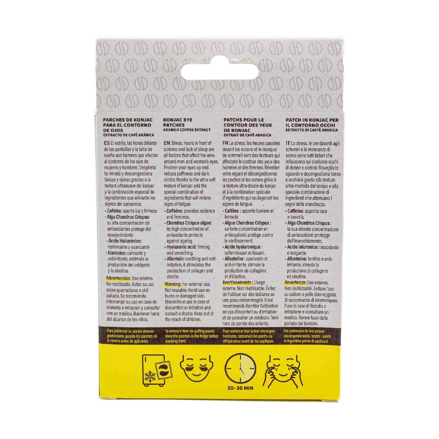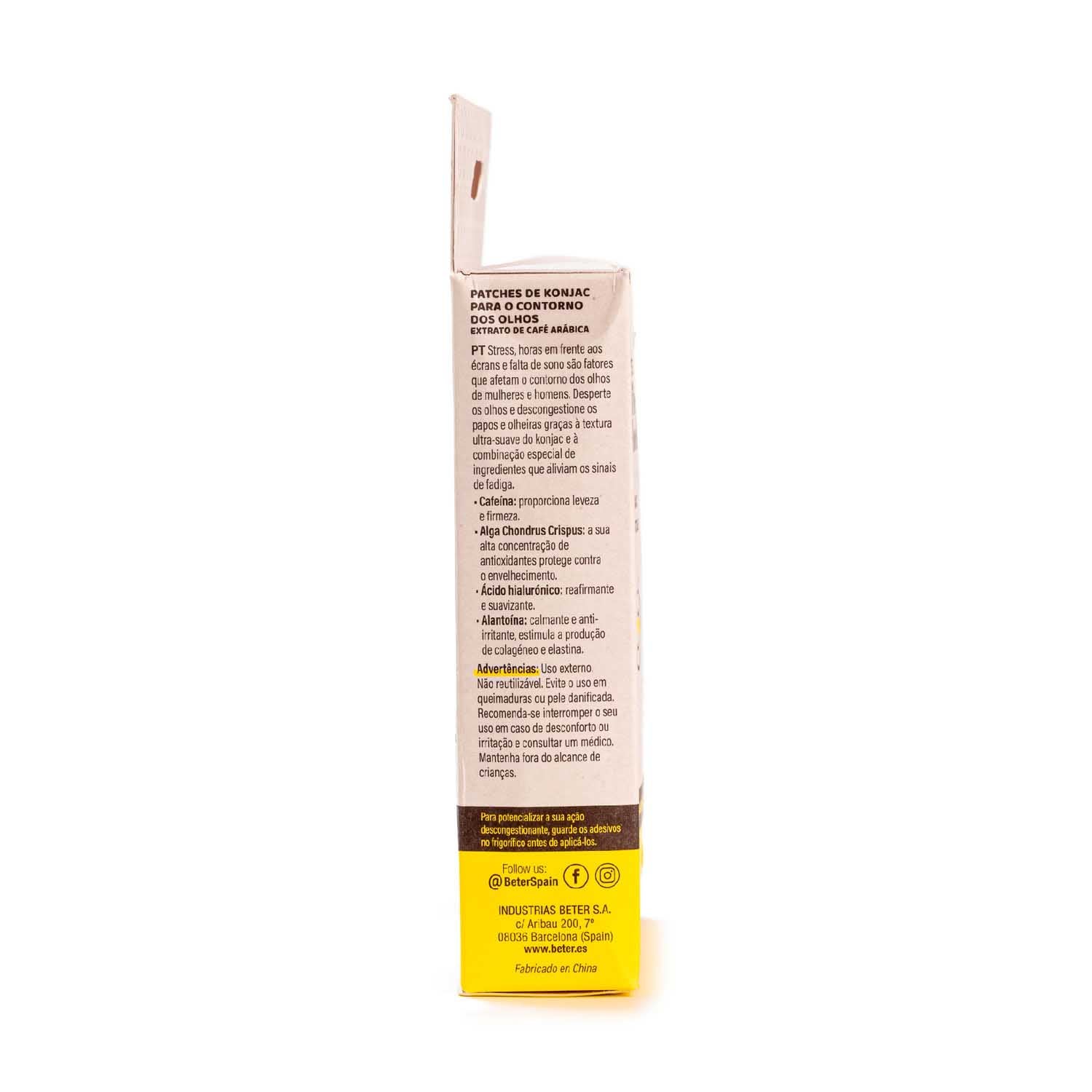 Despierta cada mañana con una mirada fresca y luminosa, y dale a tus ojos el cuidado que se merecen con los Parches para ojos de Beter. Diez pares de parches elaborados con fibra vegetal de konjac y el poderoso extracto de café arábica. La textura ultrasuave del konjac suaviza y refresca la piel, mientras que la exclusiva mezcla de ingredientes especiales alivia los signos de cansancio, bolsas y ojeras.