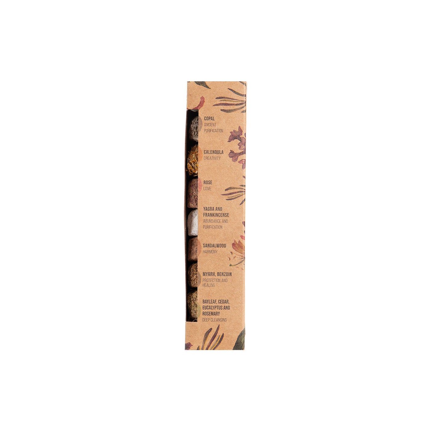 Set artesanal de defumación pensado para acompañarte en un ritual diario de purificación energética. Cada pastilla está elaborada a mano con hierbas, flores, carbón vegetal, aglutinantes naturales y sal, y está especialmente formulada para renovar y armonizar tu energía cada día de la semana.