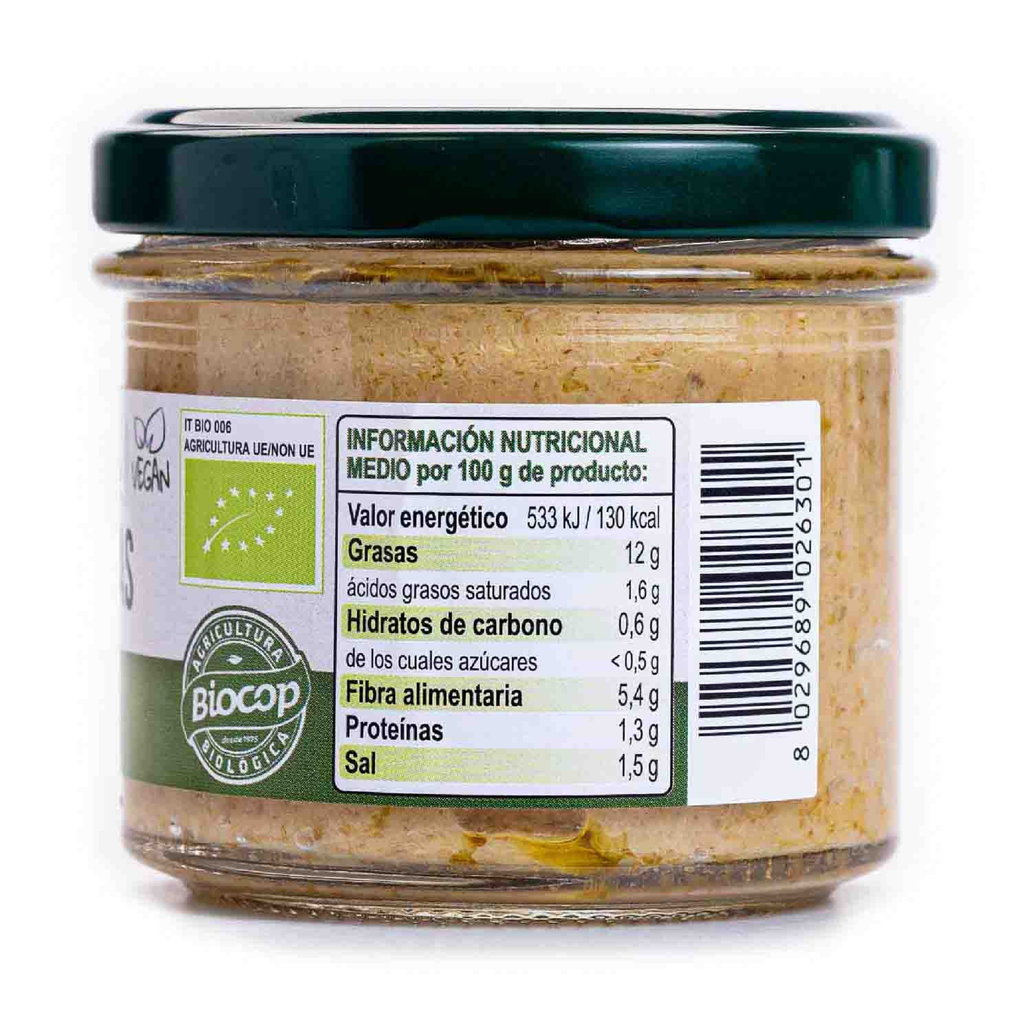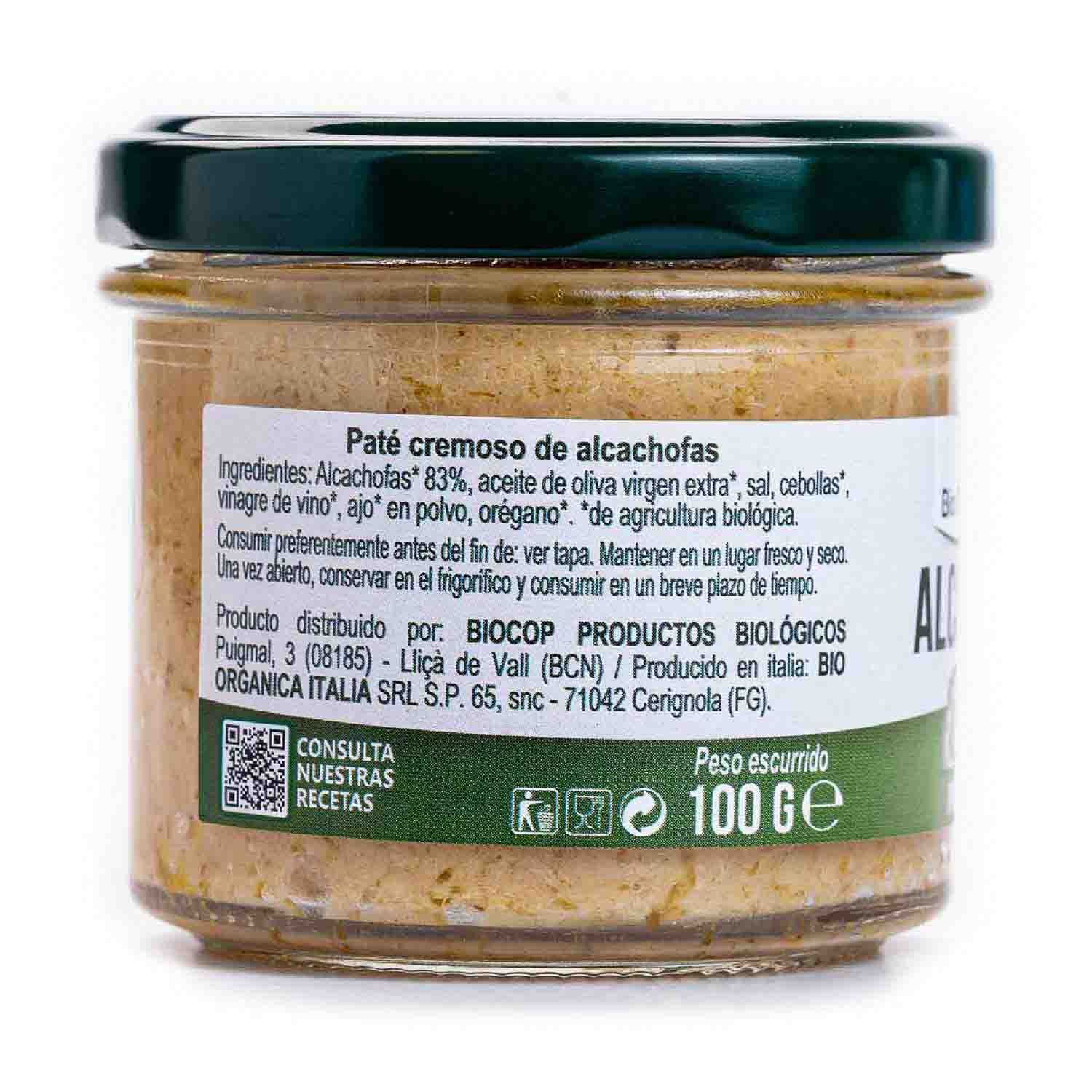 Paté cremoso de alcachofas de Biocop. Delicioso untable ecológico elaborado a base de alcachofas. Ideal para untar sobre pan, bruschetta, huevos duros y verduras o como condimento para pizzas, primeros o segundos platos a base de carne o pescado.
