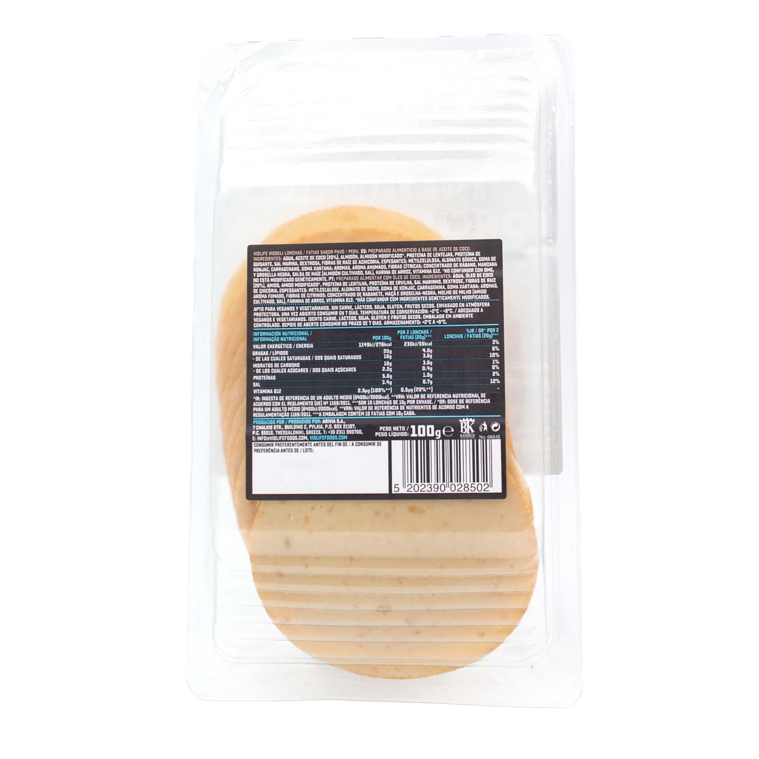 Estas lonchas son un preparado alimenticio a base de aceite de coco que recrea el sabor y la textura del pavo tradicional sin utilizar ningún ingrediente de origen animal. El ingrediente principal es el aceite de coco (20%), que aporta un toque de cremosidad y un sabor característico. Además, contienen proteínas de lentejas y guisantes, así como una mezcla de espesantes y fibras vegetales que logran una textura sorprendentemente auténtica.