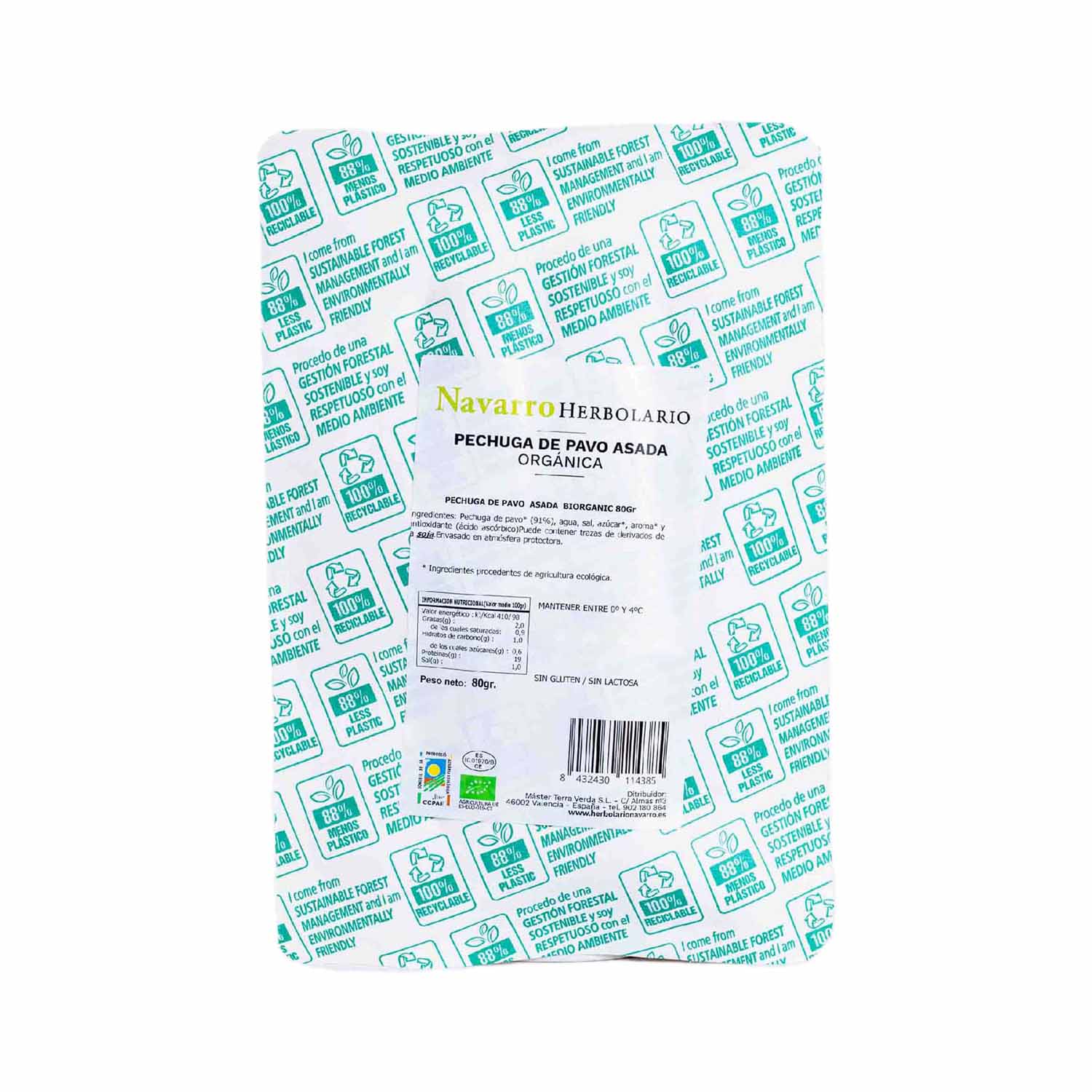 La Pechuga de Pavo Ecológico de Herbolario Navarro es un producto elaborado con un 91% de pechuga de pavo de alta calidad, este producto ofrece un sabor auténtico y natural. Además, al ser ecológico, garantiza un proceso de producción respetuoso con el medio ambiente. Sin gluten, sin lactosa y sin OGM, es una elección consciente para cuidar tu salud y disfrutar de una alimentación equilibrada. Su envase de fácil apertura, mayoritariamente compuesto de papel 100% reciclable, lo hace práctico y respetuoso con el medio ambiente.