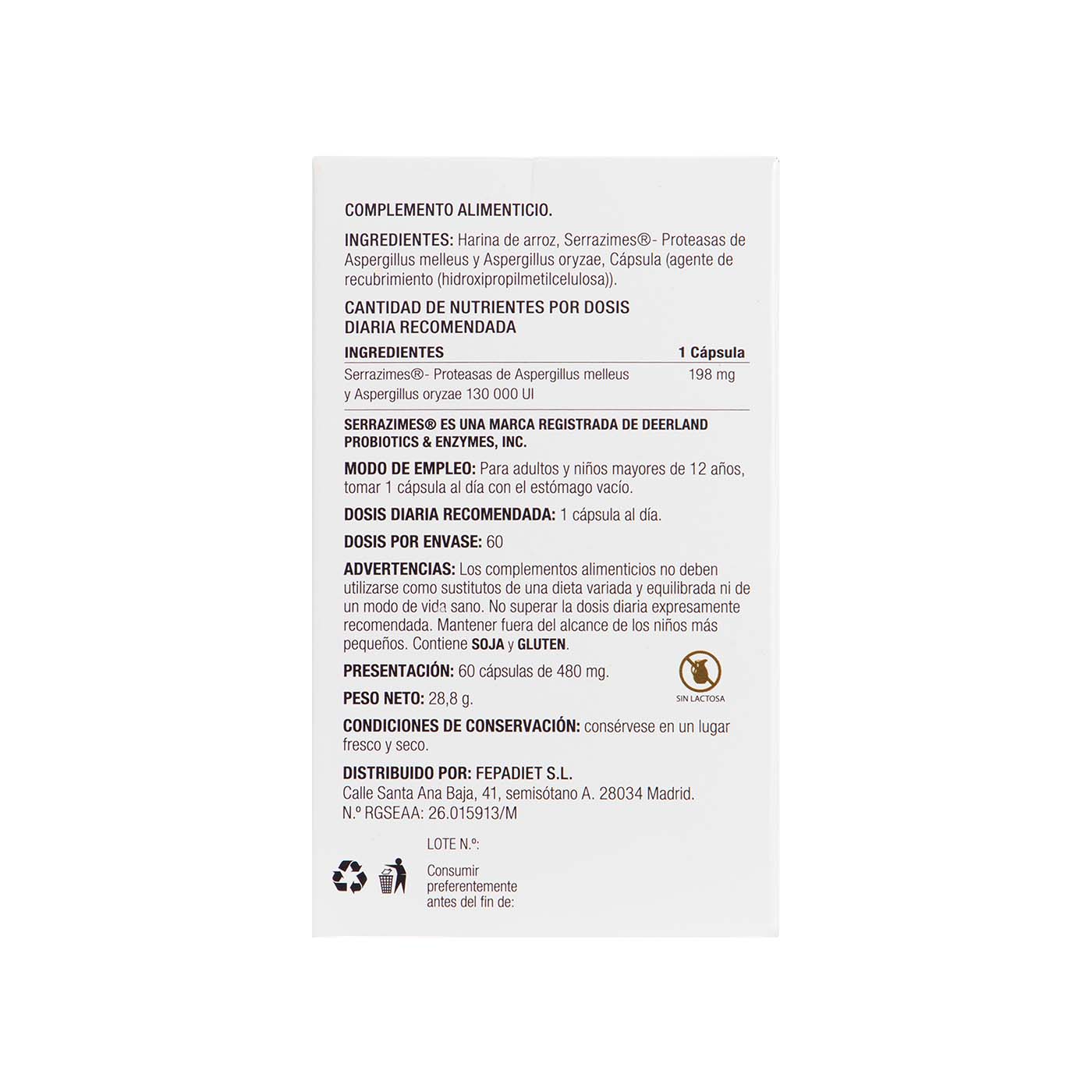 Nutrientes por 1 cápsula (dosis diaria): 198 mg de Serrazimes® (proteasas de Aspergillus melleus y Aspergillus oruzae, 130.000 UI)