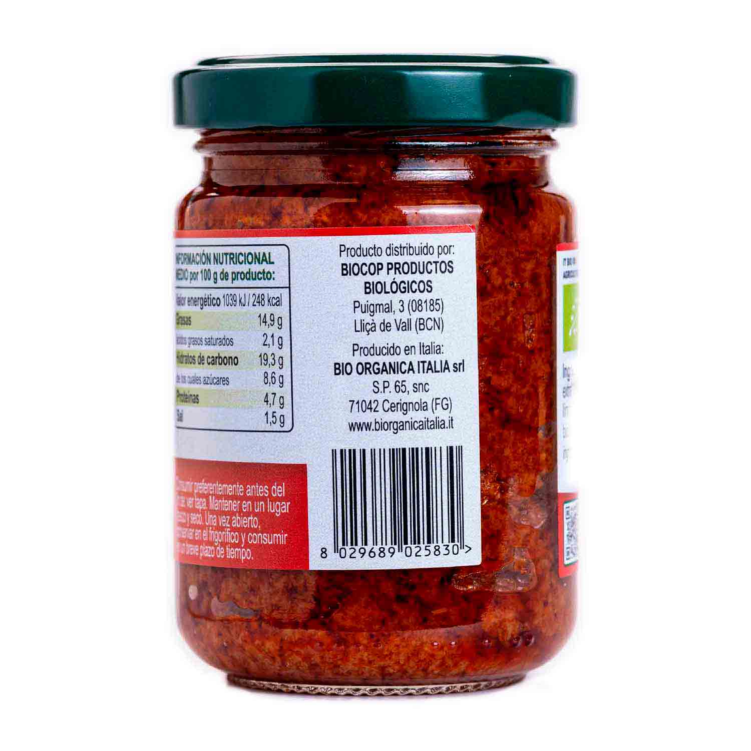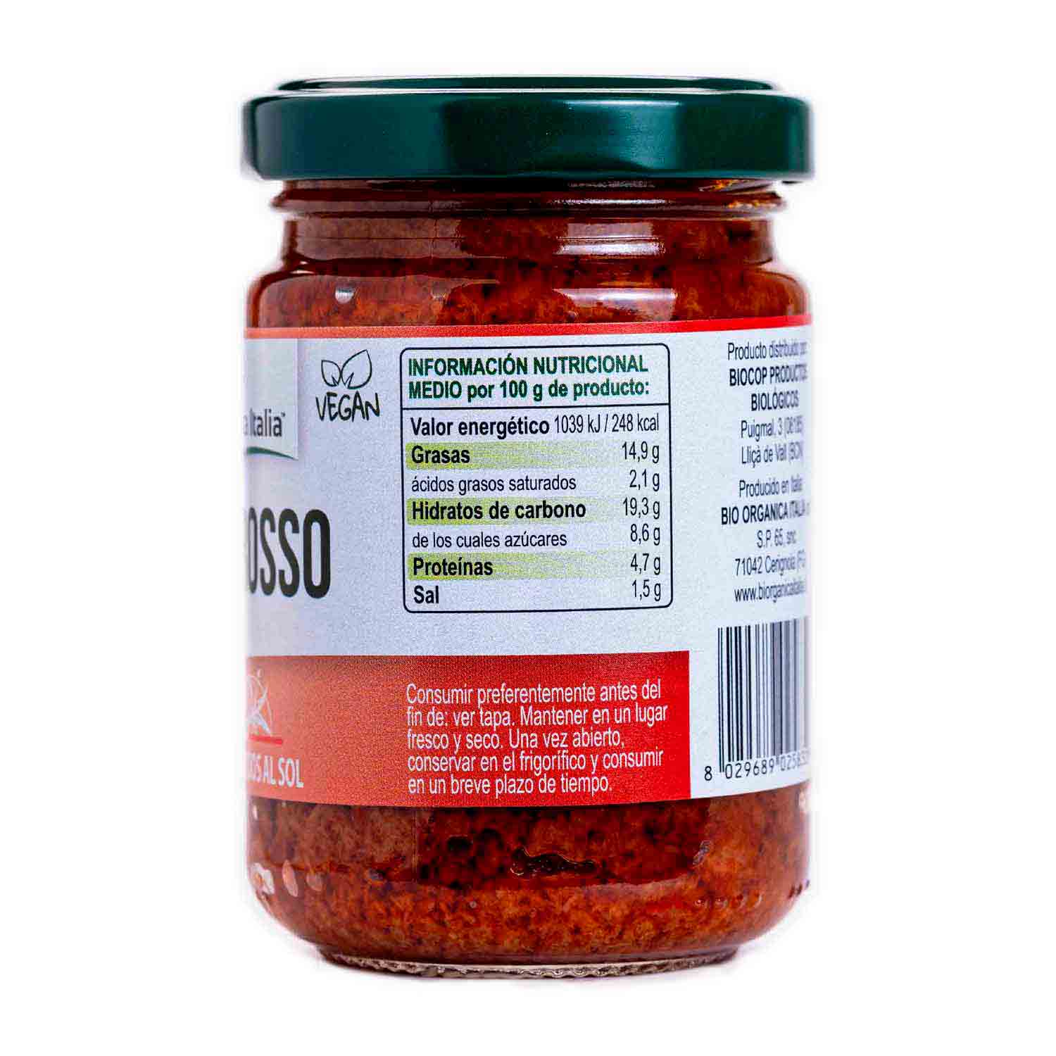 Pesto rosso vegano de tomates secos de Bior organica Italia. Un pesto aromático elaborado con tomates secos cultivados en Italia. Para acompañar a tu plato de pasta preferida o probar en pan tostado.